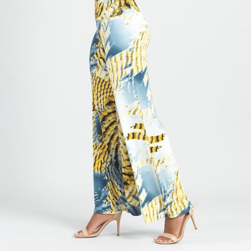 Spread your wings and soar to new fashion heights in our Palm Feather Palazzo Pant! Featuring a 3” pull-on soft waistband and ultra-flattering wide-leg silhouette that naturally flows against the body. A one-of-a-kind print, displaying graphic feathers comprised of yellow and black in palm leaf shapes, encompassed by an ivory and silver-grey gradient effect. ♥ Each piece is a unique, one-of-a-kind print and print placement will vary. An elegant, translucent fabric, inspired by luxe satin fibers. Designed to beautifully drape against the body, with the softest, velvety-silken-like finish, while being cool and smooth to the touch. Carefree Travel Fabric – Soft Silky Buttery Knit Our signature poly blend fibers create an ultra-soft, buttery feel that’s wrinkle-free and perfect for traveling. Enjoy the luxurious sensation and an indulgent touch of our fabric – you’ll never want to take it off!Wrinkle Free Travel Friendly Ultra Lightweight Soft Buttery Knit Fabric Breathable Jersey-Like Feel
