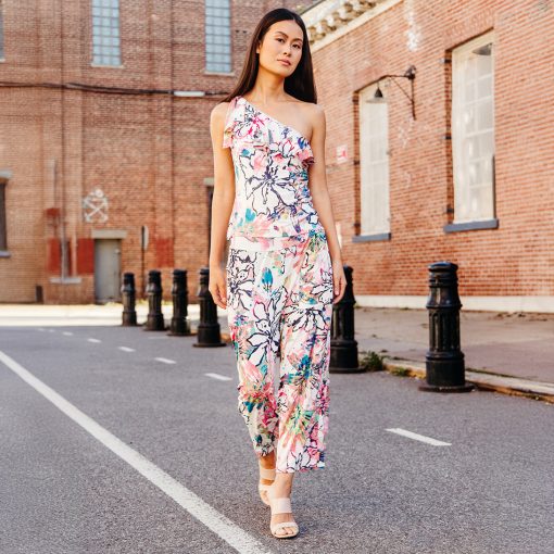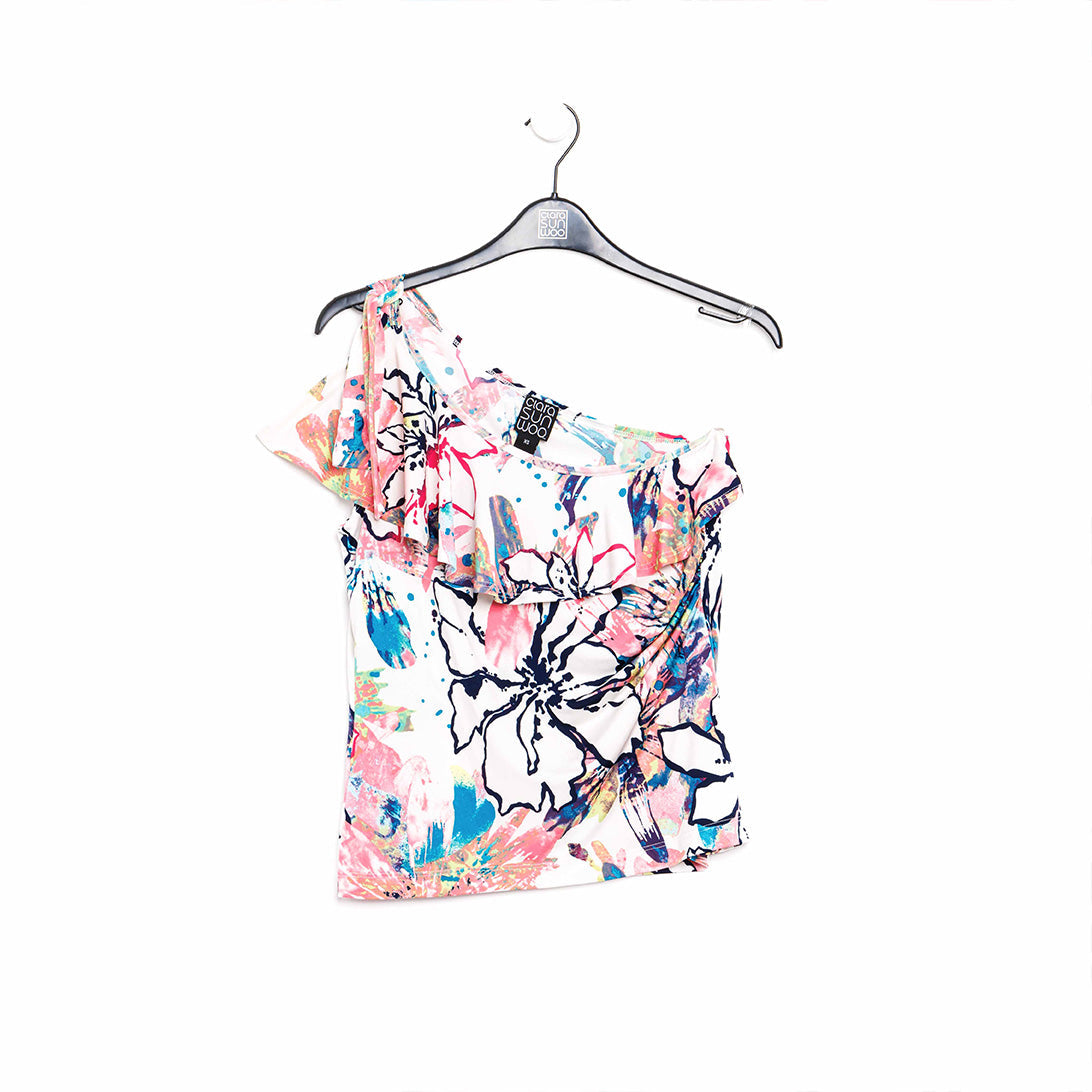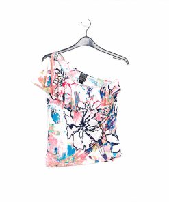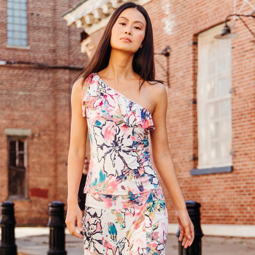 Color yourself pretty, by wearing our Water Floral Ribbon One Shoulder Ruffle Neckline Top! This style features a ruffled, asymmetrical neckline created by a sleek, one-shoulder, bra-friendly strap which displays a charming, ribbon-tie detail, and a straight hemline. An eye-catching print, displaying drawn and watercolor floral shapes in gorgeous warm-pastel shades, against an ivory, uber-soft, butter-knit background. ♥ Each piece is a unique, one-of-a-kind print and print placement will vary. An elegant, translucent fabric, inspired by luxe satin fibers. Designed to beautifully drape against the body, with the softest, velvety-silken-like finish, while being cool and smooth to the touch.Carefree Travel Fabric – Soft Silky Buttery Knit Our signature poly blend fibers create an ultra-soft, buttery feels that’s wrinkle-free and perfect for traveling. Enjoy the luxurious sensation and an indulgent touch of our fabric – you’ll never want to take it off!Wrinkle Free Travel Friendly Ultra Lightweight Soft Buttery Knit Fabric Breathable Jersey-Like Feel