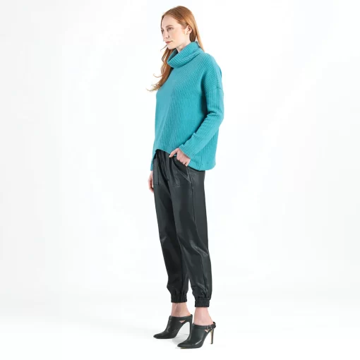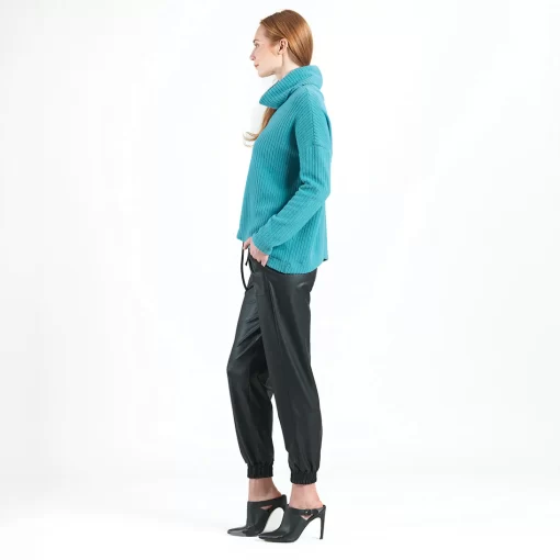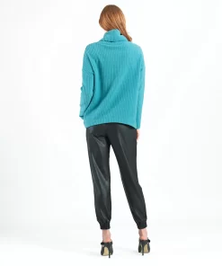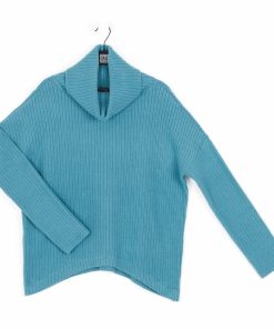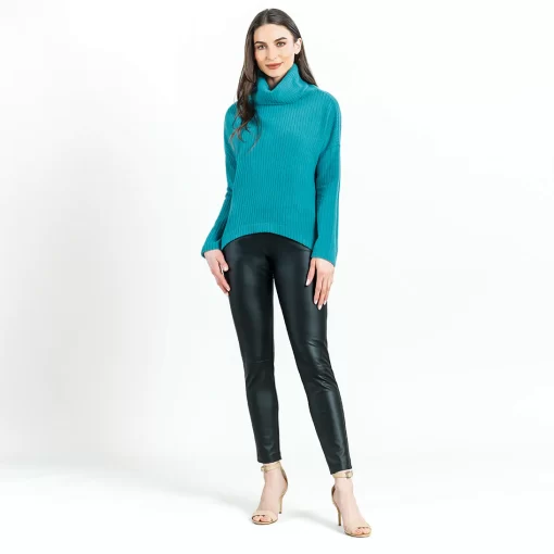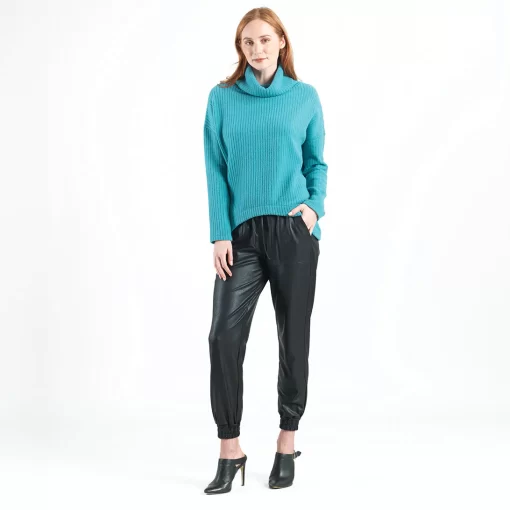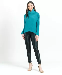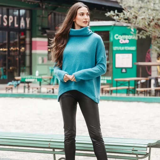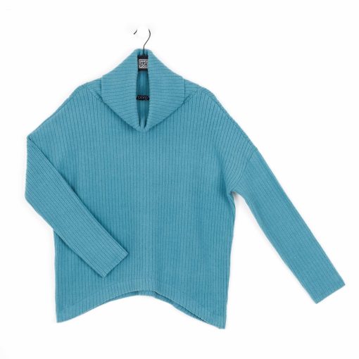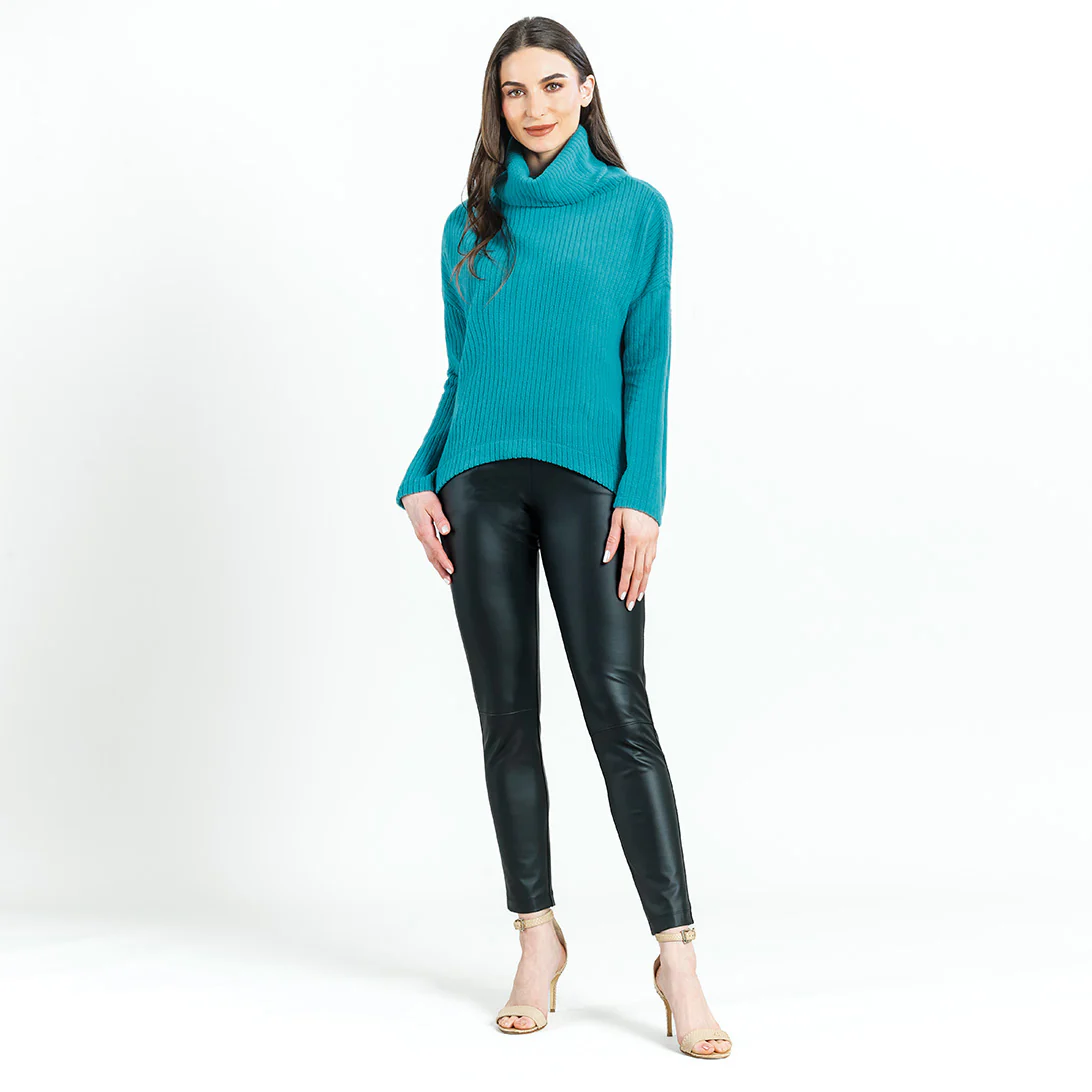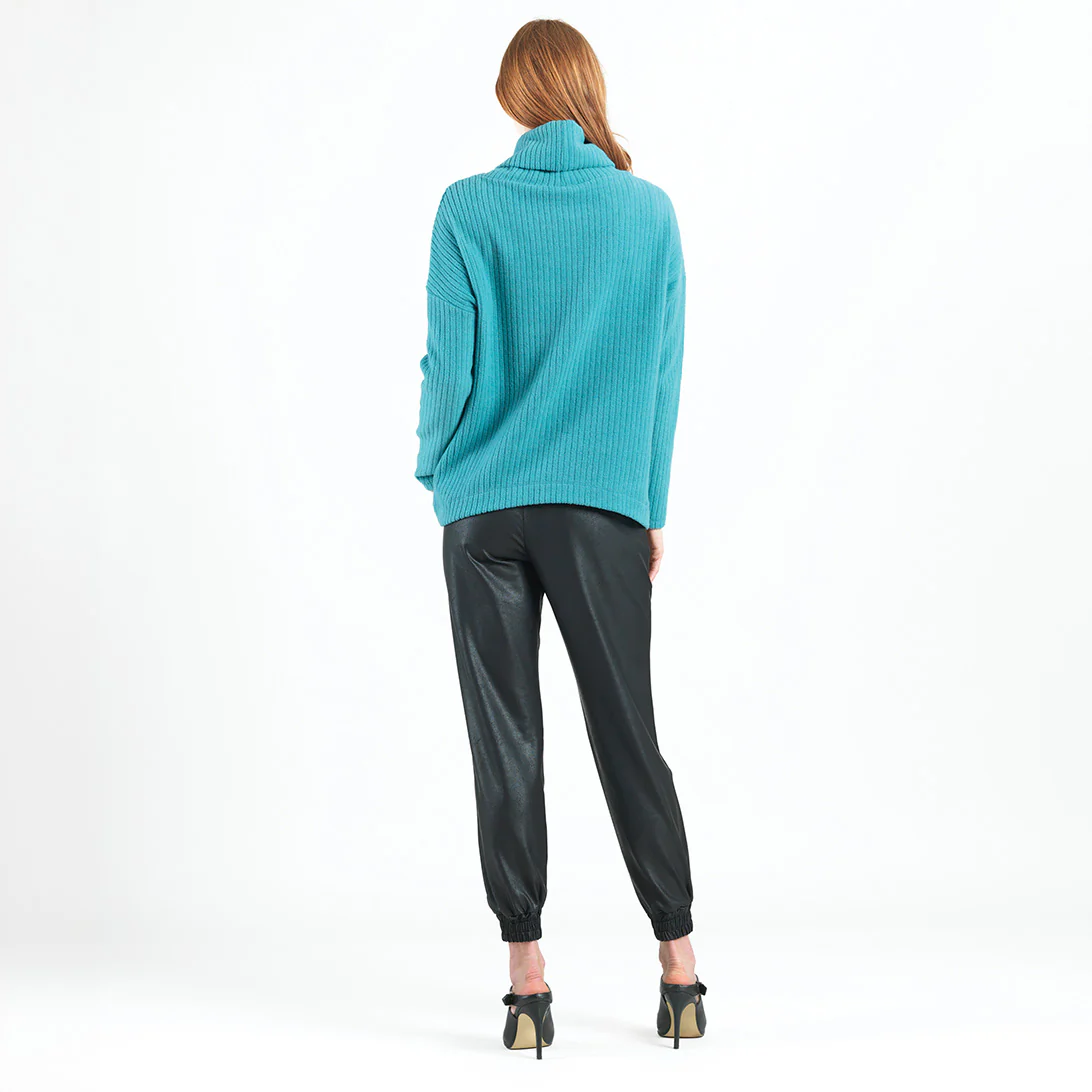 If you’re looking for a style that combines contemporary fashion with luxurious warmth, then look no further than our Chunky Ribbed Tipped Hem Sweater Top! This sweater features a cowl-style turtleneck, long sleeves, and a tipped hemline. Our Teal color is a warm, light teal shade with blue-aquamarine undertones.Chunky Cotton-Ribbed Sweater Knit Our Poly-Cotton Blend sweater knit is constructed from a thicker, mid-heavy weight fabric. Its sturdy ribbed texture is meant to provide substantial warmth and a heavy drape, with a chunky structure that retains its shape for long-lasting use. Known to get softer with each wear while maintaining exceptional durability that is easy to care for and travel-friendly!Travel Friendly Chunky Ribbed Texture Thicker, Mid-Heavy Weight Fabric