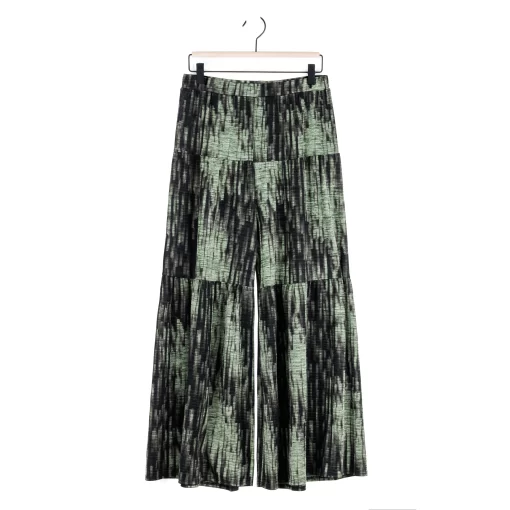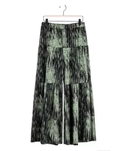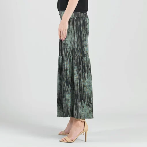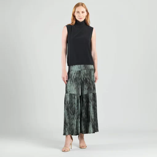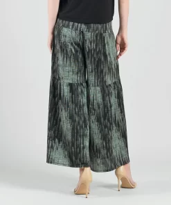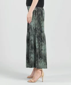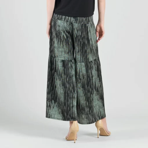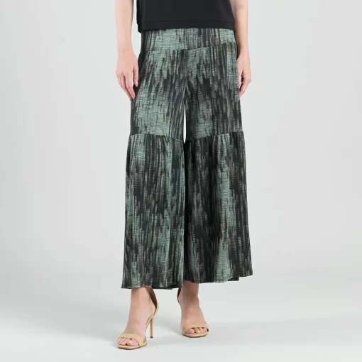 Your fashion tide is sure to rise, wearing our Water Ripple Crinkle Pleat Tiered Skirt-Pant! This one-of-a-kind style features a 1.5” pull-on elastic waistband, an ultra wide-leg silhouette that visually looks like a skirt, and provides beautiful, fluid movement with double-tier details which create a gorgeous drape that naturally flows against the body. **cardigan & tank twinset sold separately An abstract print that displays a mesmerizing pattern reminiscent of the subtle movement of tranquil water drops, comprised of shades of olive green and black. A new, high-quality fabric inspired by crinkle-pleat fibers. Designed with a distinct texture thanks to its lusciously soft ridges. It is durable, retains its shape, and creates a beautiful drape with a luxurious finish, and pleasant breathability.Carefree Travel Fabric – Soft Crinkle Pleat Knit Our signature poly-spandex blend fabric provides a finish that is rich in texture while being soft, providing lightweight stretch, and is breathable with quick-drying properties. This delicate fabric offers refined durability with crinkled dimension for visual interest. Perfect for warm or transitional weather, you can pack it up and go with ease! 1.5″ Elastic Waistband 20″ Leg Hemline Wrinkle Free Travel Friendly Durable and Lightweight Soft Crinkle-Texture
