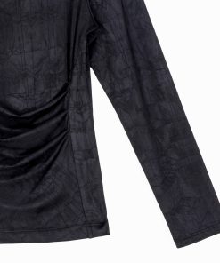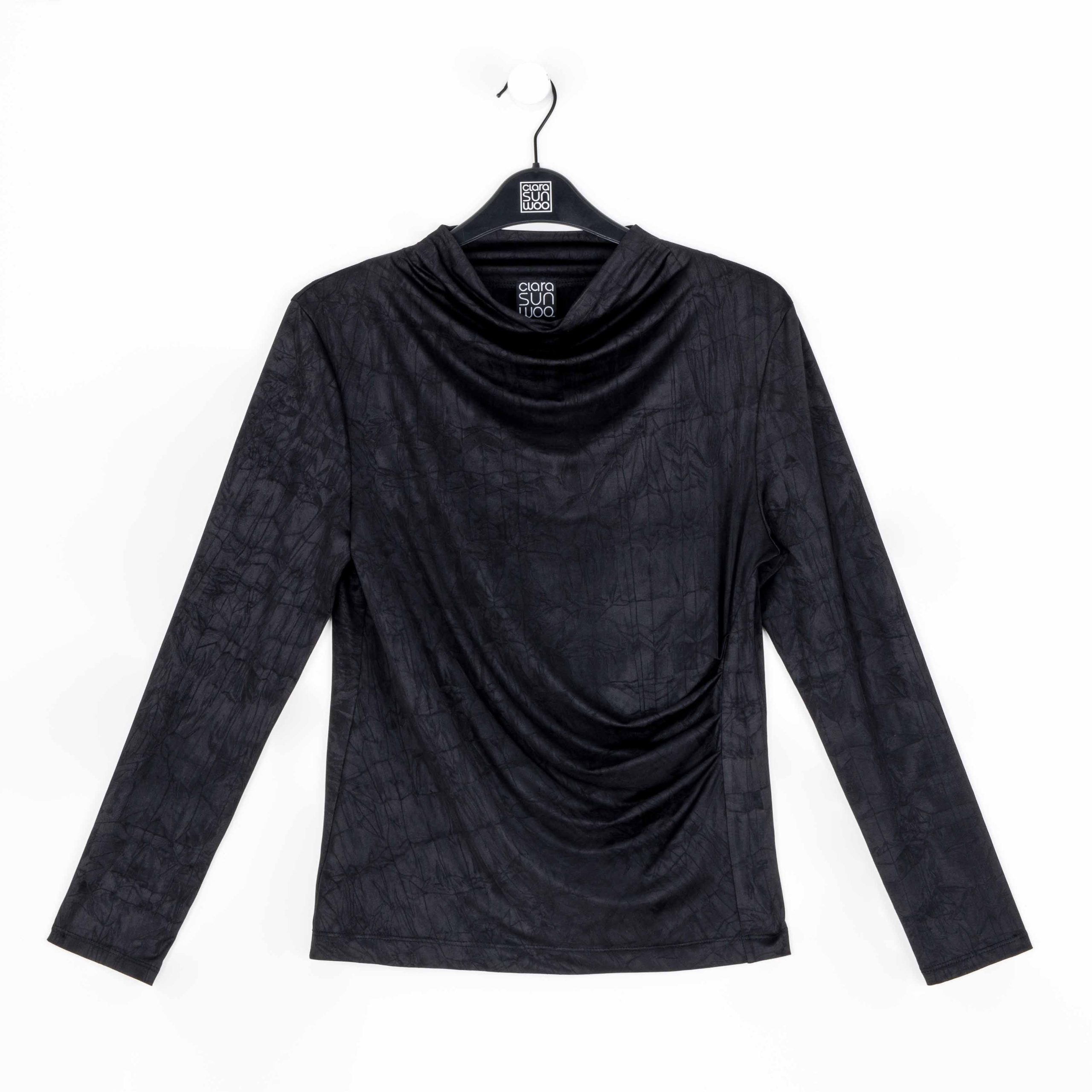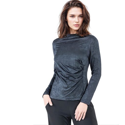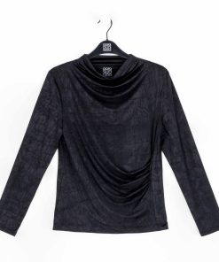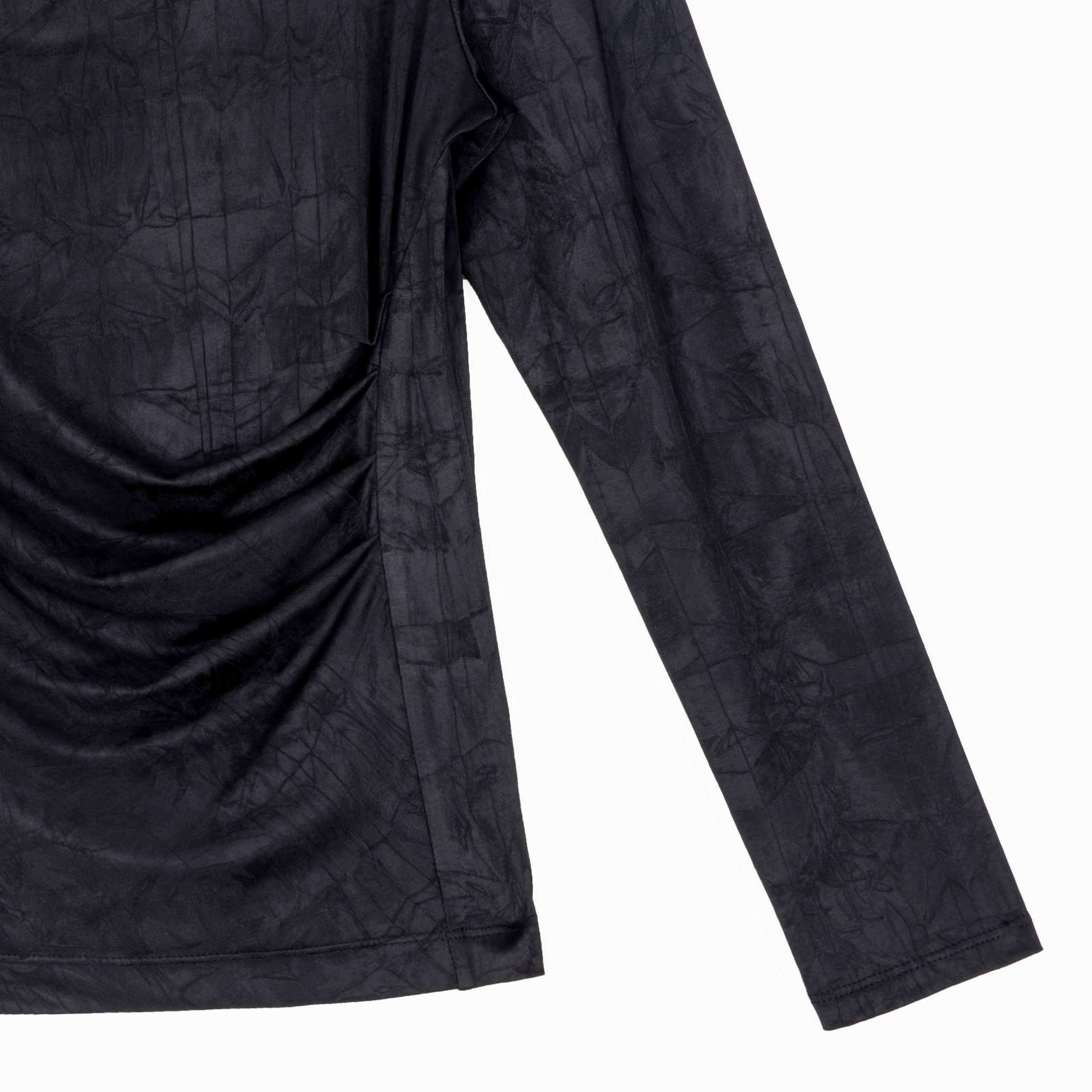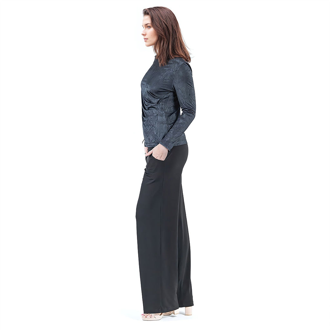 Embrace the queen inside of you with our Crushed Silk Draped Neck Side Ruched Top! Featuring a draped funnel neckline, long sleeves, and a lower left-side ruched bodice that beautifully accentuates the natural curve of the body with a straight hemline. Our crushed silk Black shade is a soft pearlescent color with a sheen finish. A new, luxuriously romantic fabric, inspired by delicate dupioni-silk fibers. Designed with a distinct, soft crushed texture, that gives off a sheen-like radiance, while being cool and smooth to the touch. Carefree Travel Fabric – Crushed-Silk Knit Our signature soft stretch poly blend mimics the texture of crushed silk, providing a lightweight and breathable fabric with easy care and quick-drying properties. This fabric is more breathable and cool to the touch compared to linen and cotton, perfect for warm-weather clothing. Pack it up and go with ease!Wrinkle Free Travel Friendly Ultra Lightweight Soft Knit Fabric Crushed Silky Texture
