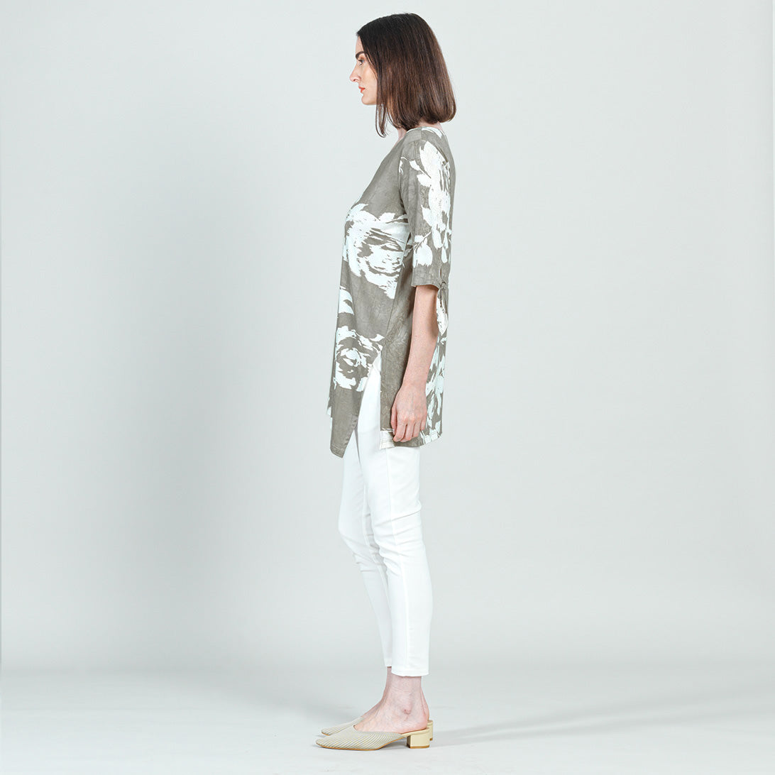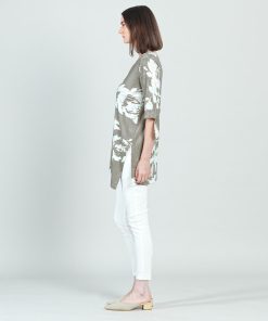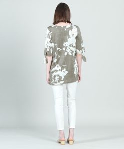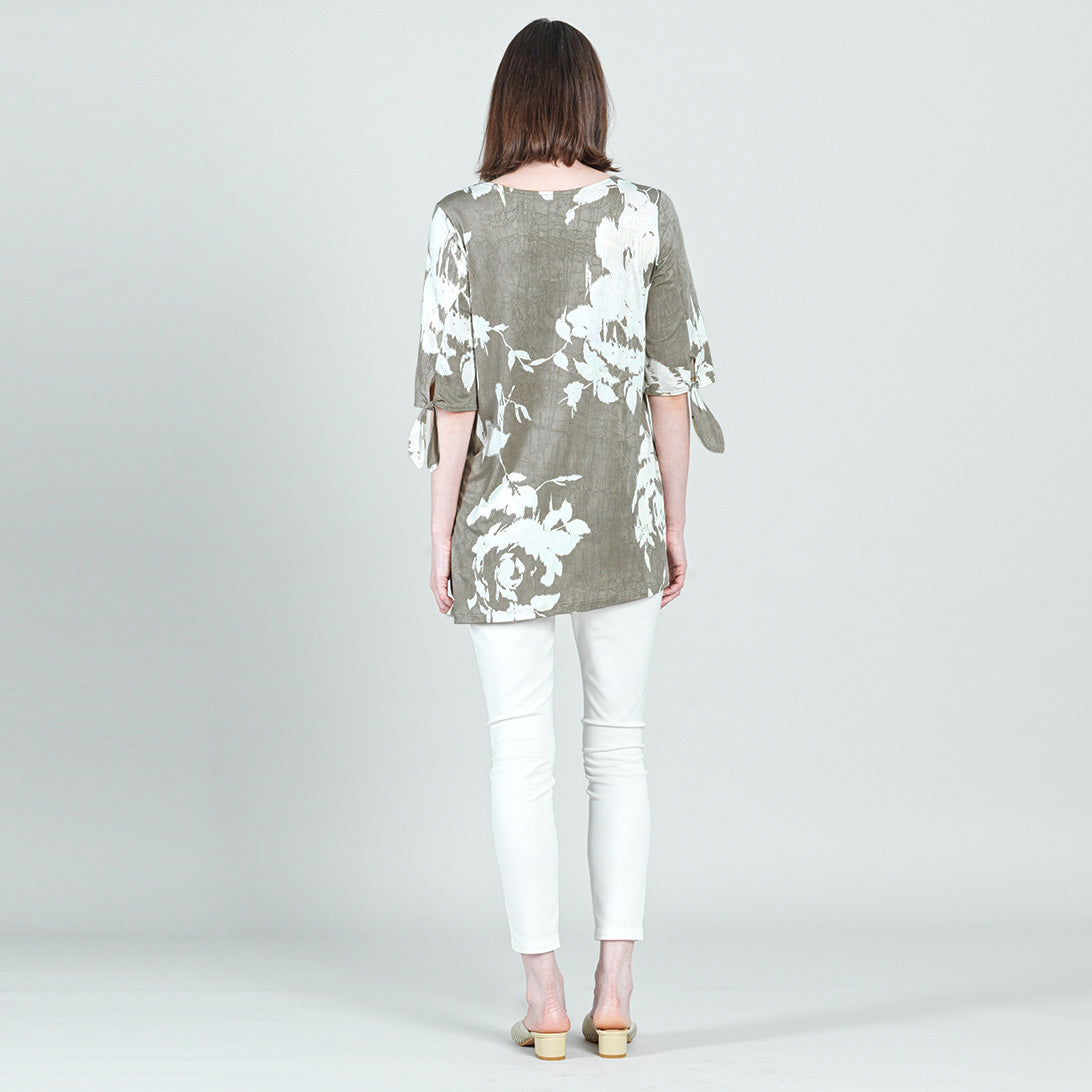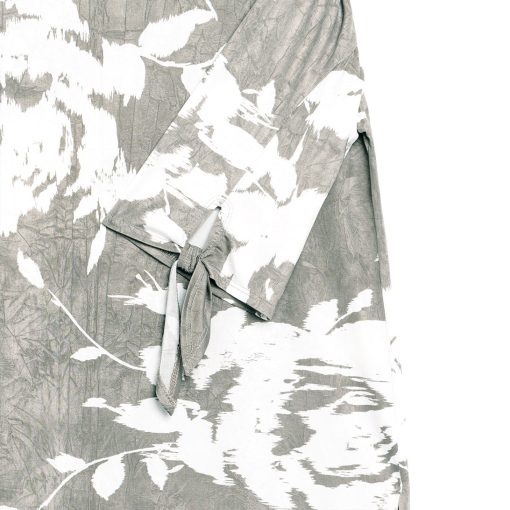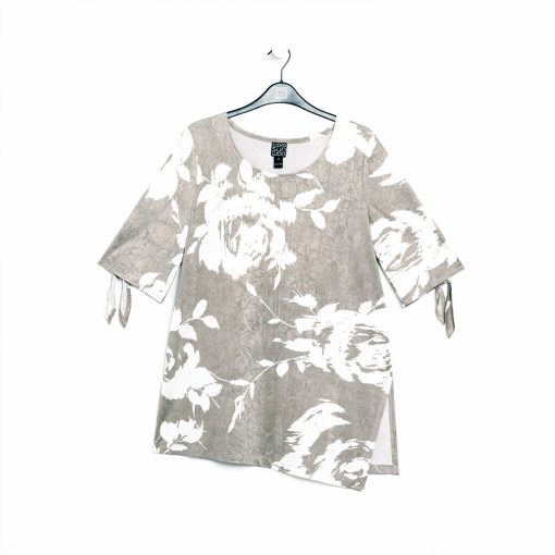 Clara Sunwoo Crushed Silk Knit – Tie Cuff Asymmetrical Vent Tunic – Dreamy Floral-Taupe – Final Sale! taupewhite | Womens Tops + Tunics