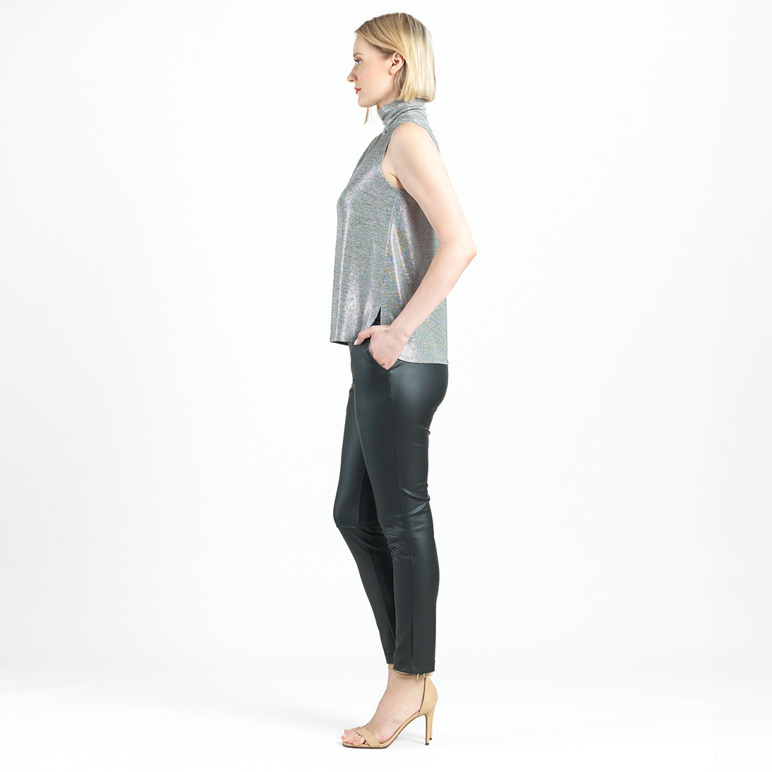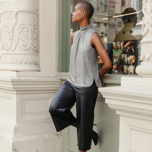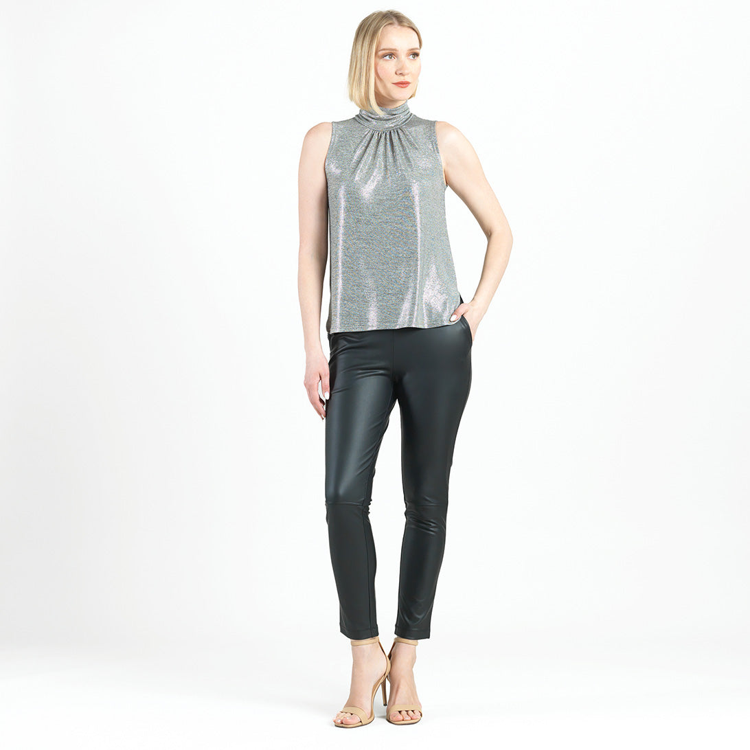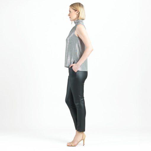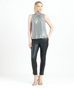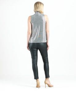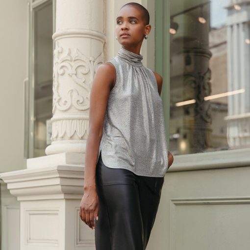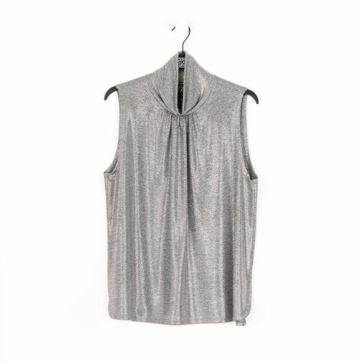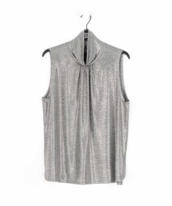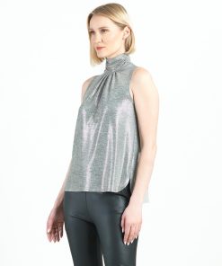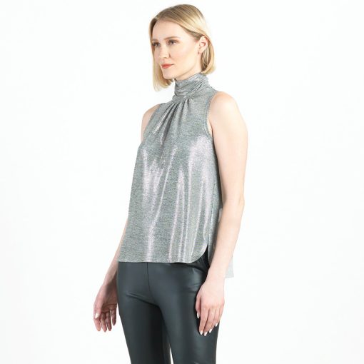 You’ll feel like you belong on the silver screen when wearing our glamorous Glimmer Lamé Sleeveless Pleated Detail Tank! This sleeveless, bra-friendly style features a mock neckline, and feminine center pleated detail that begins at the neck and transitions to a soft-draped body, with a 3″ side-vented scallop hemline. Our Glimmer Lamé silver color is a shimmery pewter shade with sparkly twinkle specks. A new, lavishly spectacular fabric, inspired by deluxe sparkle lamé fibers. Designed with incredible stretch and a delicate grainy texture that provides a reflective, metallic-twinkle finish. Lightweight Glimmer Lamé Knit This glimmer fabric is a super lightweight and stretchy material. Made with a semi-opaque solid backing and soft textured shimmery-knit face. Its stretch provides an effortless drape with mid-light body weight. Breathable with quick-drying properties, this fabric is long-lasting and retains its shape.Wrinkle Free Travel Friendly Grainy Shimmery Texture Reflective Twinkle Finish Mid-Lightweight Stretch Knit Fabric