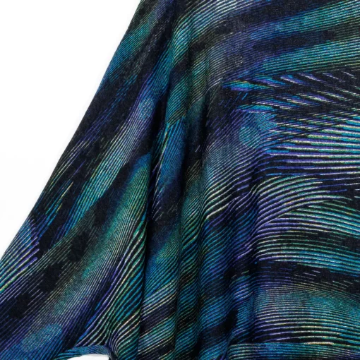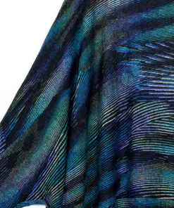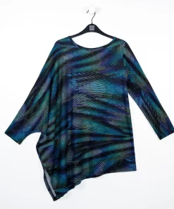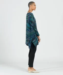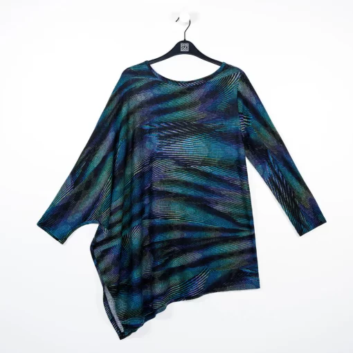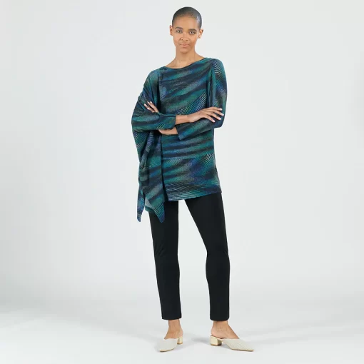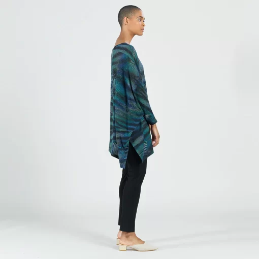 Strut your inner confidence by wearing our Peacock Pinstripe Poncho Sleeve Sweater Tunic! This innovative style features a wide, round neckline, and long sleeves which display a left standard sleeve and right poncho sleeve that beautifully cascades an ample amount of fabric into a long-vented, draped angle hemline. This print displays vibrant shades of blues, teal, greens, and purple that collectively work to create a complementary peacock pattern encompassed by sleek subtle pinstripes. ♥ Each piece is a unique, one-of-a-kind print and print placement will vary. Lightweight Cozy Sweater KnitOur cozy sweaters are designed for optimal comfort and convenience. Made from lightweight soft plush knit and Poly-Blend fibers, they are the perfect addition to any wardrobe. Ideal for layering and is travel-friendly but still breathable enough to keep you from getting too warm.Travel Friendly Lightweight Sweater Knit Soft Cozy Texture