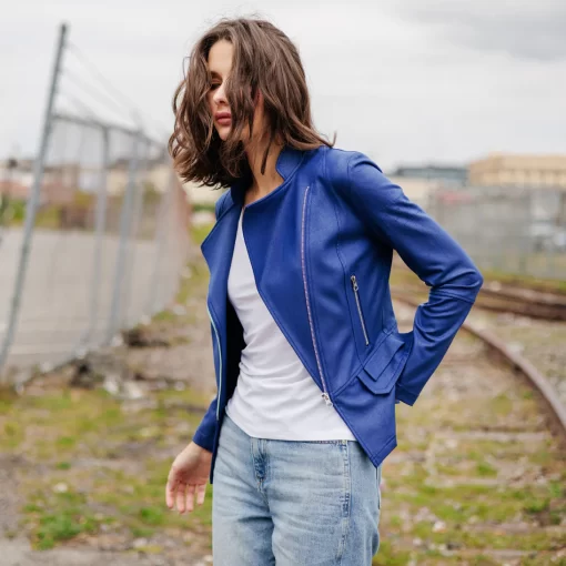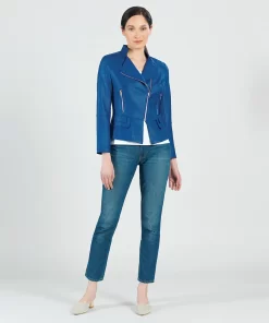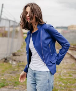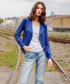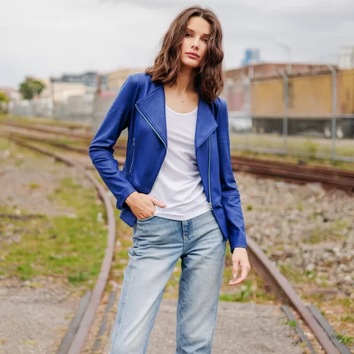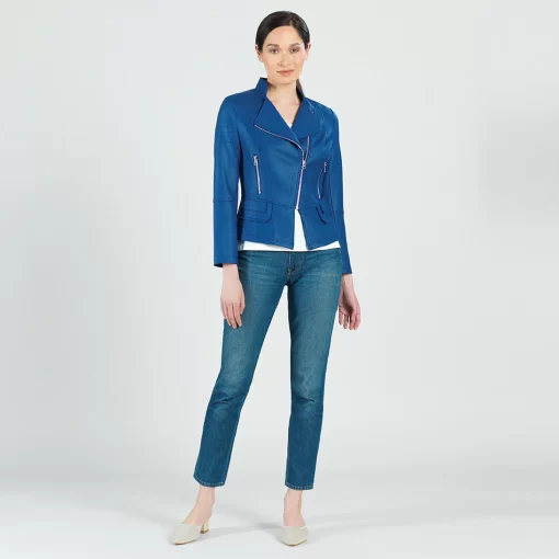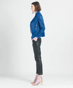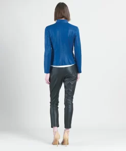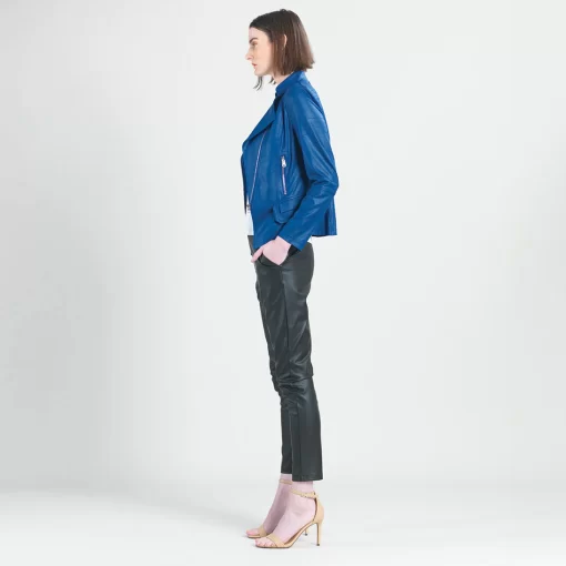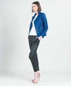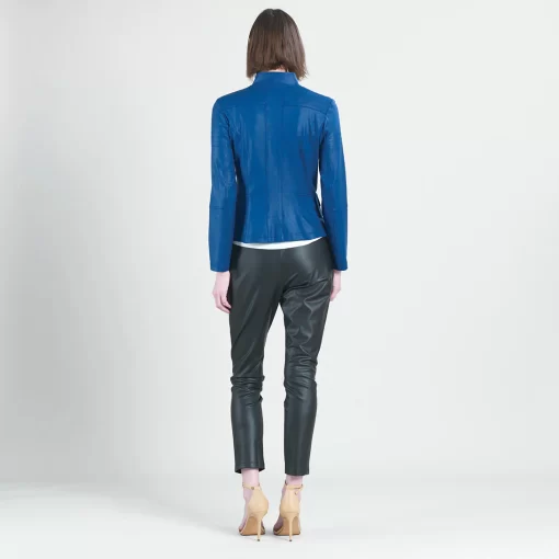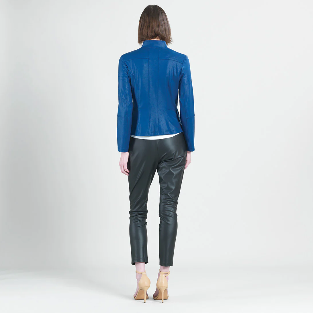 When innovation is combined with an edge you’ll be sure to see our Liquid Leather Biker Jacket! This unique design is made from our beautiful signature stretch knit, extremely lightweight soft “lambskin feel” fabric with a soft matte finish. This jacket features a notched lapel with an upright collar, long sleeves with upper arm stitching, a silver asymmetrical waist zip-up closure, faux pocket zipper slits, and peplum waist seam with structured double-tiered flaps, as well as curved and vertical back seams that provide a more shaped and slender silhouette… and best of all it’s vegan friendly! Our Cobalt shade is a true royal blue color with deep vivid undertones. Inspired by luxury motorcycle jackets, the interior is made from soft knit giving it the right amount of stretch with breathable superb wear that conforms to your body and provides you with the utmost comfort. Clara Sunwoo | Favorite Things from CS on Vimeo.Liquid Leather KnitThis vegan-friendly fabric offers superior comfort and style. Crafted from our signature flexible polyester blend and coated in a faux leather-like matte finish, it’s cool to the touch, quick-drying, and easy to maintain. Enjoy the look and feel of leather without the guilt.Travel Friendly Ultra Lightweight Soft Knit Fabric – Faux Leather Matte Finish Vegan Friendly!