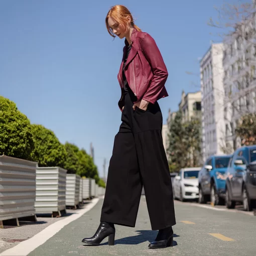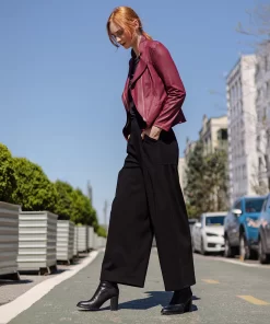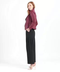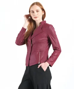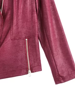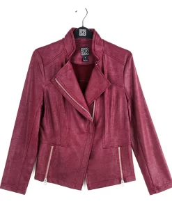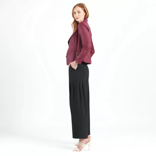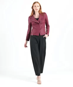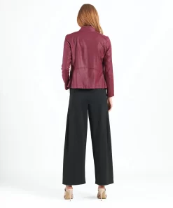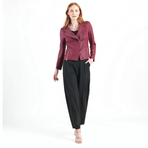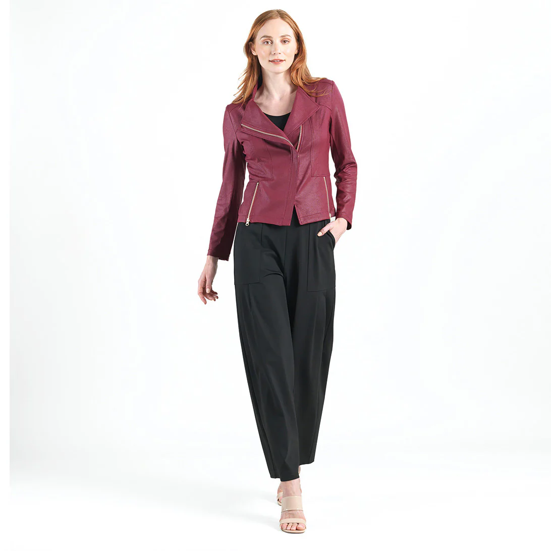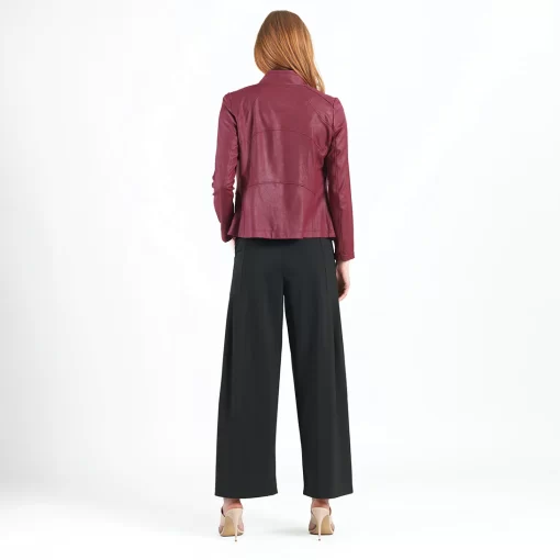 Our Liquid Leather Signature Jacket is a style you can be sure will age like a fine wine! Made from our beautiful signature stretch knit, extremely lightweight soft “lambskin feel” fabric with a soft matte finish. This jacket features a notched lapel with upright collar, long sleeves, silver asymmetrical zip closure, faux pocket zipper slits as well as complimentary detailed front and back stitching. Our Merlot shade is a rich, dark red color with mahogany undertones. The interior is made from soft knit giving it the right amount of stretch with breathable superb wear that conforms to your body and provides you with a figure-flattering silhouette and best of all it’s vegan friendly!Clara Sunwoo | Favorite Things 2021 from CS on Vimeo.Liquid Leather KnitThis vegan-friendly fabric offers superior comfort and style. Crafted from our signature flexible polyester blend and coated in a faux leather-like matte finish, it’s cool to the touch, quick-drying, and easy to maintain. Enjoy the look and feel of leather without the guilt.Travel Friendly Ultra Lightweight Soft Knit Fabric – Faux Leather Matte Finish Vegan Friendly!
