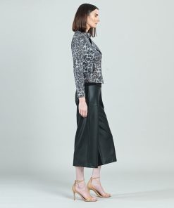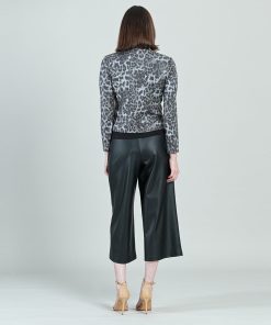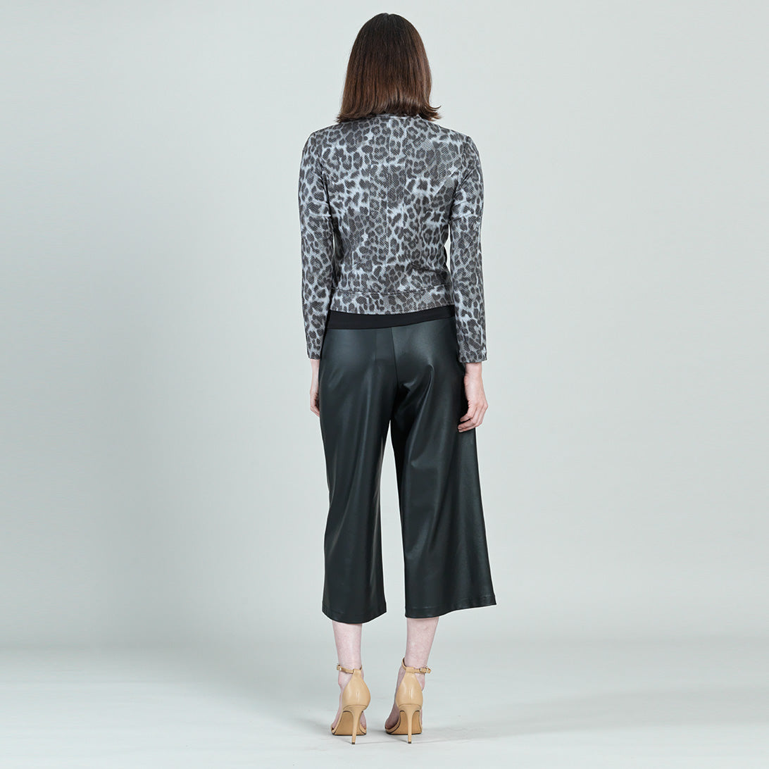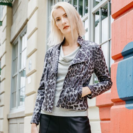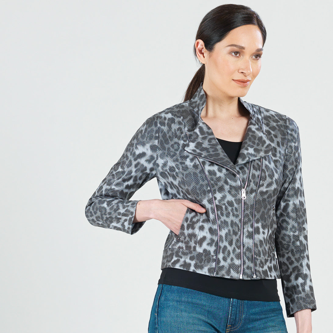 Have all the more reason to be spotted everywhere you go in our Charcoal Cheetah Liquid Leather Textured Double Zip Pocket Jacket! Featuring a notched lapel with an upright collar, silver vertical zip closure with a double zipper detail allowing for a customized silhouette, long sleeves, side pockets with snap details, and beautiful pipe stitching throughout the jacket. Our Charcoal Cheetah print displays a variety of black cheetah spots encompassed by shades of true cool grey and subtle steel blue undertones with a scale-like texture that creates a realistic effect. Made from our beautiful signature stretch knit, extremely lightweight soft “lambskin feel” fabric with a soft matte finish. The interior is made from soft knit giving it the right amount of stretch and providing you with breathable superb wear, best of all it’s vegan-friendly! Clara Sunwoo | Favorite Things from CS on Vimeo. Textured Liquid Leather KnitThis vegan-friendly fabric offers superior comfort and style. Crafted from our signature flexible polyester blend and coated in a faux leather-like scale-like matte finish, it’s cool to the touch, quick-drying, and easy to maintain. Enjoy the look and feel of leather without the guilt.Travel Friendly Ultra Lightweight Soft Knit Fabric – Faux Leather Scale-Like Textured Matte FinishDouble Zip Detail Vegan Friendly!