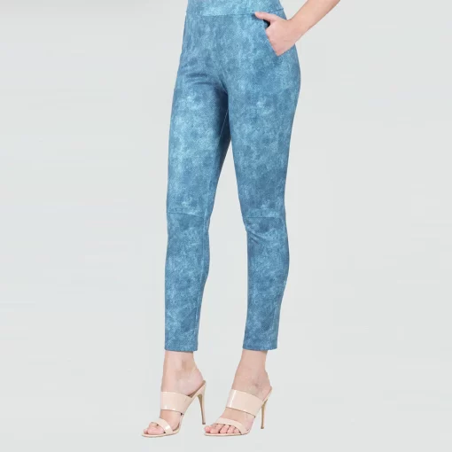 You’ll feel like a blue jean baby, wearing our Denim Print Liquid Leather Skinny Pocket Pant pour all over you! This stylish pant features a beautiful, soft-sheen finish, a 1” pull-on elastic waistband, a skinny silhouette with horizontal knee boning and best of all, pockets! A style that will flatter any figure & the best part is while they have a slimming silhouette they are not skin tight so won’t reveal any body flaws. Our Denim print displays an acid wash of denim blue, navy, and subtle hints of white with a scale-like texture that creates a realistic jean effect. Textured Liquid Leather KnitThis vegan-friendly fabric offers superior comfort and style. Crafted from our signature flexible polyester blend and coated in a faux leather-like scaled-like textured finish, it’s cool to the touch, quick-drying, and easy to maintain. Enjoy the look and feel of leather without the guilt. 1″ Elastic Waistband Ultra Lightweight Soft Knit Fabric – Faux LeatherScale-Like Textured Matte Finish Vegan Friendly!