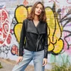 Zip through your day in style wearing our Liquid Leather Zip Cuff Moto Waist Jacket! This uniquely modern jacket features a beautiful soft-matte finish, a classic fold-over collar with a notched lapel, long sleeves with zipper cuff details, an asymmetrical closure with silver hardware, zippered chest accents, a back yoke with two vertical side back seams, and a seamed waist-length hemline with an adjustable button hem detail. A feminine take on men’s motorcycle jackets. Coated with extremely lightweight, vegan-friendly leather and an interior that is made from soft knit giving it the right amount of stretch with breathable superb wear that conforms to your body and provides you with the utmost comfort. Clara Sunwoo | Favorite Things from CS on Vimeo.Liquid Leather KnitThis vegan-friendly fabric offers superior comfort and style. Crafted from our signature flexible polyester blend and coated in a faux leather-like matte finish, it’s cool to the touch, quick-drying, and easy to maintain. Enjoy the look and feel of leather without the guilt.Travel Friendly Ultra Lightweight Soft Knit Fabric – Faux Leather Matte Finish Vegan Friendly!