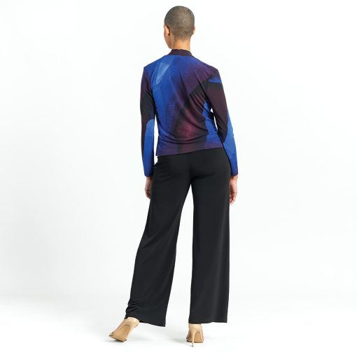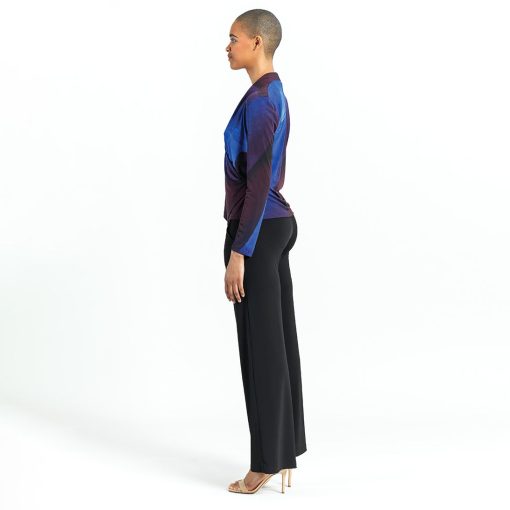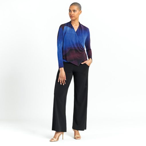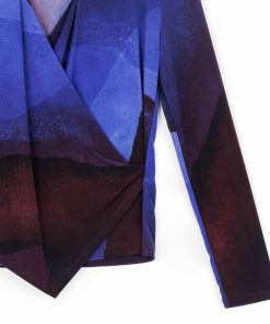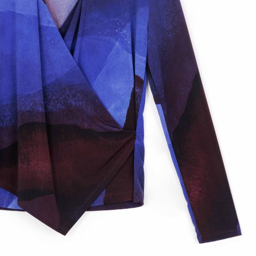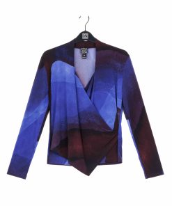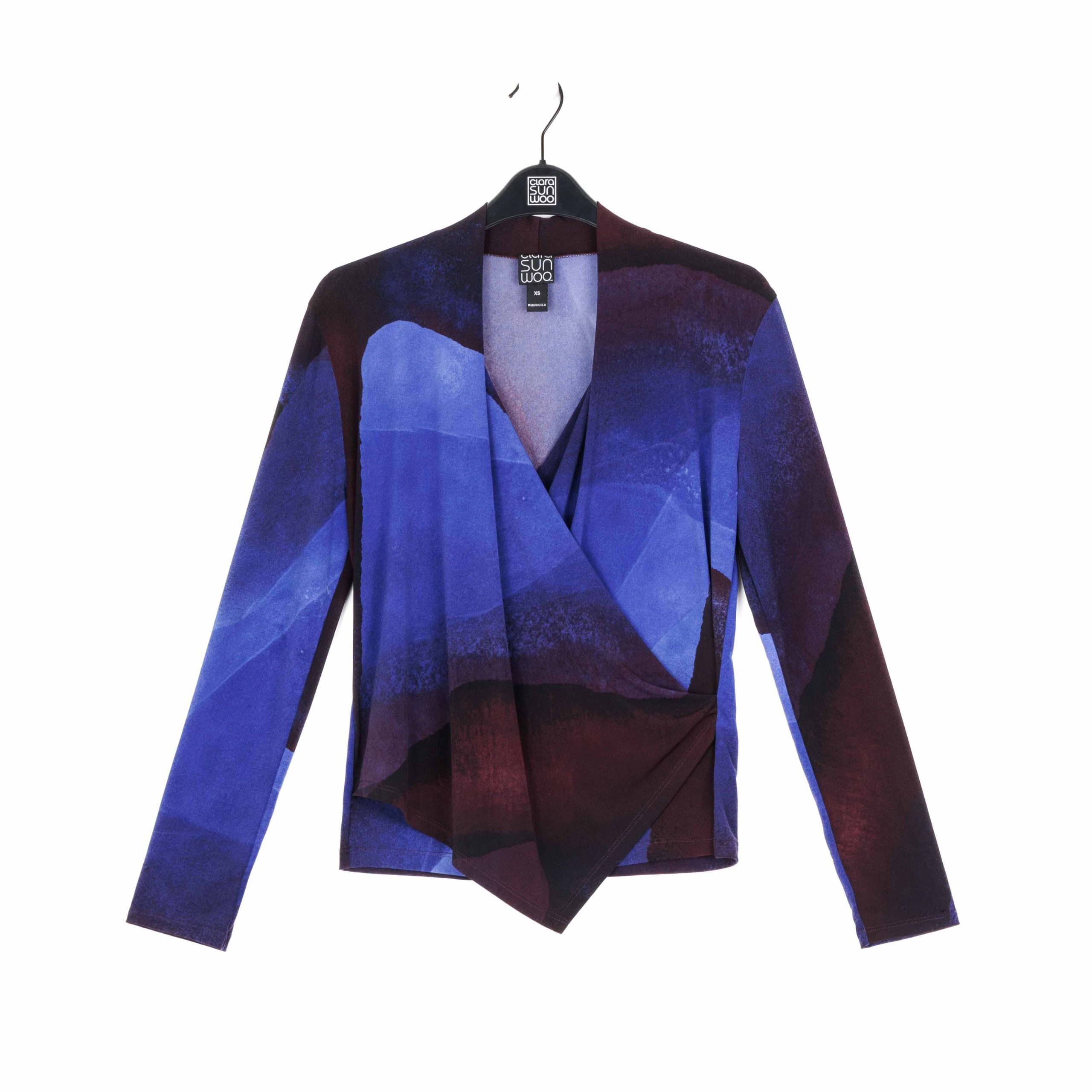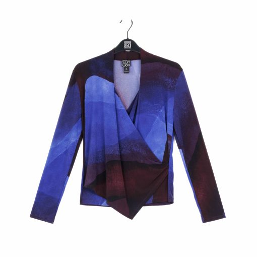 Paint your way into elevated fashion with our Watercolor Long Sleeve Crossover Faux Wrap Top! This top features a cross-over, high surplice neckline, long sleeves, and a faux wrap bodice with a modern overlay, against a straight hemline.Beautiful, rich shades of purple, eggplant, navy, cobalt, and black, create a gradient and blend together to display a faded watercolor effect. ♥ Each piece is a unique, one-of-a-kind print and print placement will vary. Carefree Travel Fabric – Soft Silky Knit Our signature poly blend fibers offer luxurious softness with lightweight, wrinkle-free comfort. This easy-care fabric is quick drying and cooler than linen or cotton, making it perfect for on-the-go wear.Wrinkle Free Travel Friendly Ultra Lightweight Soft Knit Fabric Breathable Jersey-Like Feel