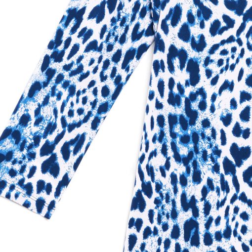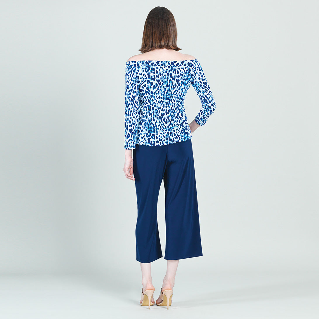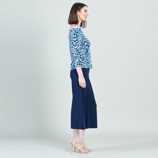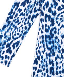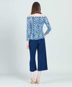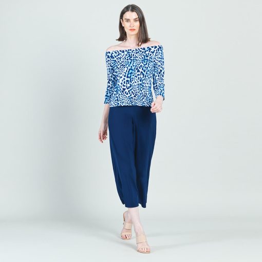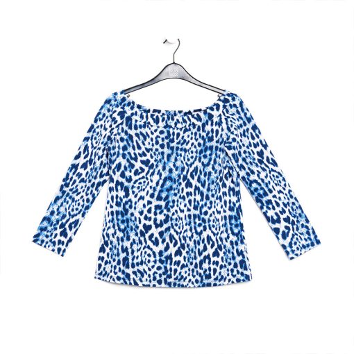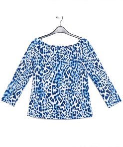 Get spotted for all the right reasons in our Baby Cheetah Off-Shoulder Top! This top features a straight across neckline, 3/4 length sleeves, and a straight hemline. A whimsical print, featuring small clusters of navy cheetah spots, encompassed by true blue shades, against a white background. ♥ Each piece is a unique, one-of-a-kind print and print placement will vary. Carefree Travel Fabric – Soft Silky Knit Our signature poly blend fibers offer luxurious softness with lightweight, wrinkle-free comfort. This easy-care fabric is quick drying and cooler than linen or cotton, making it perfect for on-the-go wear.Wrinkle Free Travel Friendly Ultra Lightweight Soft Knit Fabric Breathable Jersey-Like Feel
