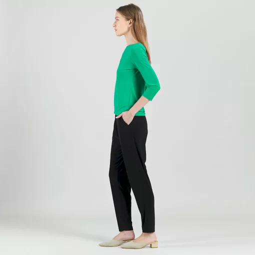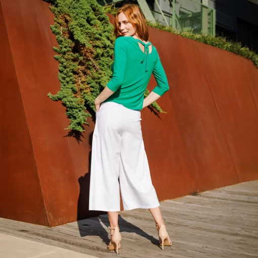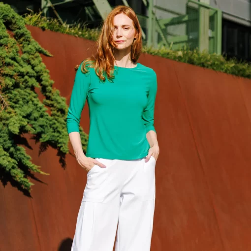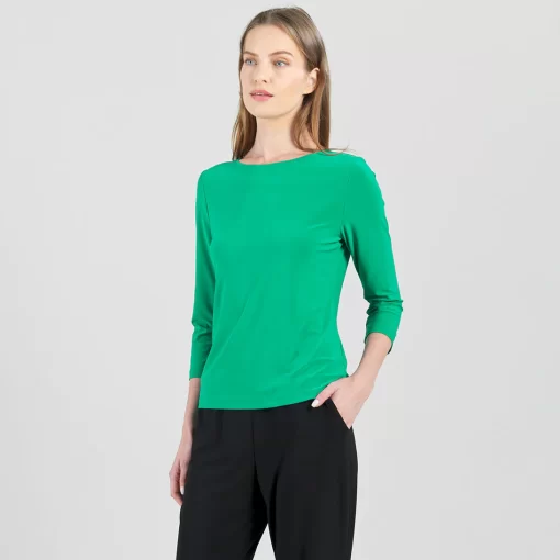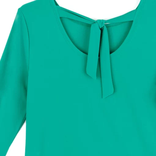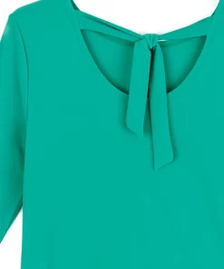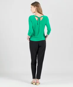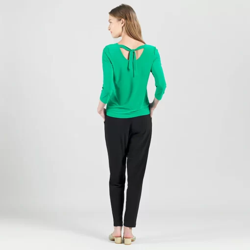 Our Reversible Back Tie Top is a basic silhouette with feminine features! Featuring a round neckline, 3/4 length sleeves, a straight hemline, and a reversible charming back tie detail. ♥ Can also be worn with the back tie in the front for an alternative neckline! Our Emerald shade is a vibrant, mid-tone color, with kelly green undertones.Carefree Travel Fabric – Soft Silky Knit Our signature poly blend fibers offer luxurious softness with lightweight, wrinkle-free comfort. This easy-care fabric is quick drying and cooler than linen or cotton, making it perfect for on-the-go wear.Reversible Back Tie Detail Wrinkle Free Travel Friendly Ultra Lightweight Soft Knit Fabric Breathable Jersey-Like Feel