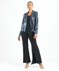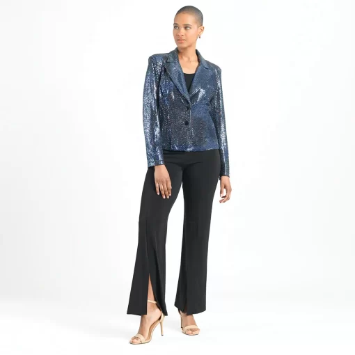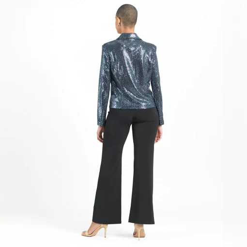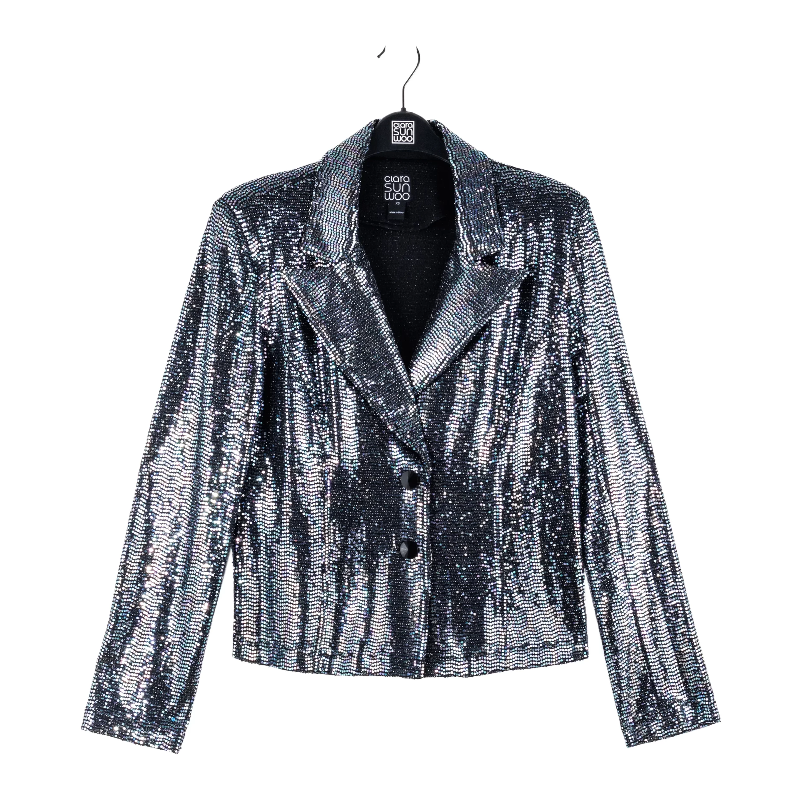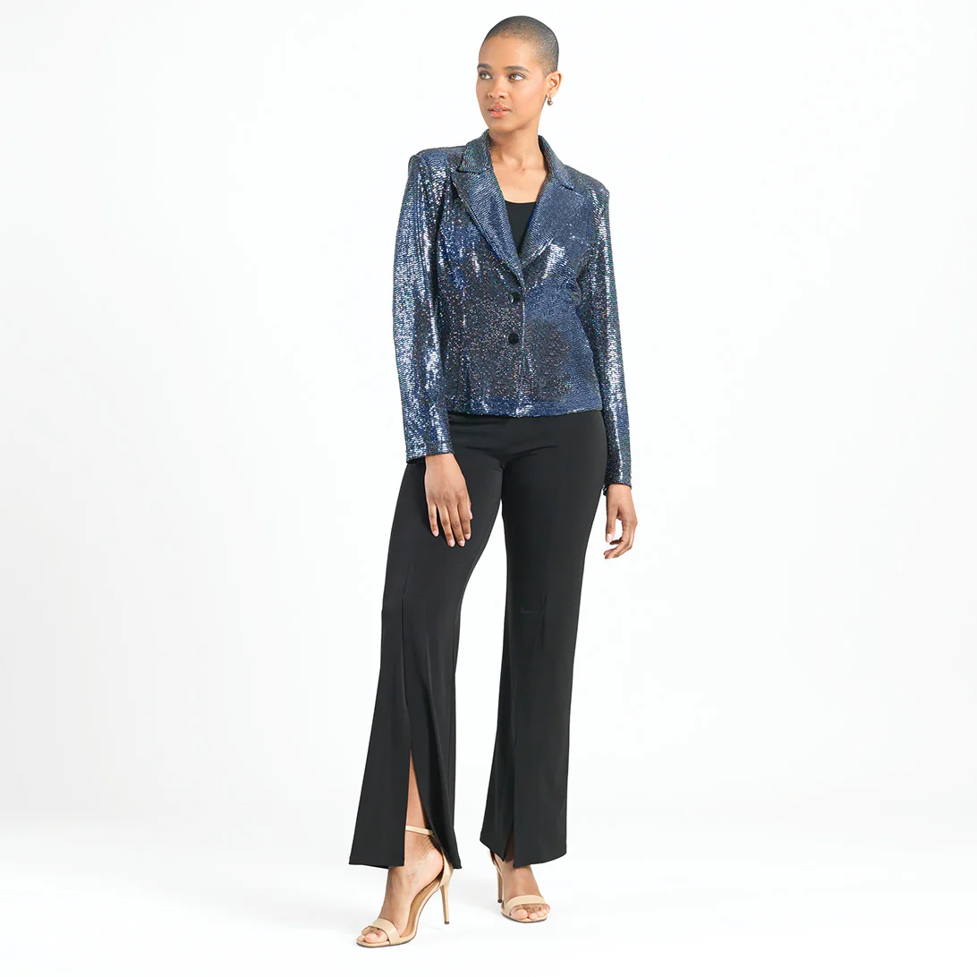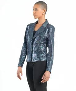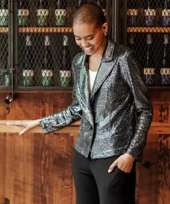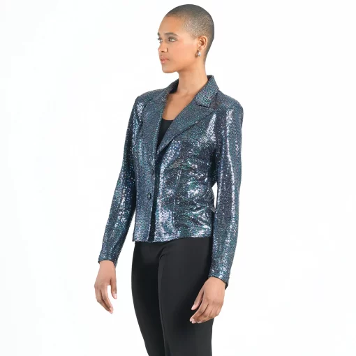 Blaze a new fashion trail and leave a little sparkle behind in our Sequin Knit Modern Button Blazer! This beautiful blazer features a standard collar with a peak lapel, inner shoulder pads, long sleeves, single-breasted-diamond-shaped shiny black 2-button closure, and bodice princess seaming. Our Gunmetal shimmer sequin is a dark silver chrome that creates a galactic coloration comprised of blue and purple undertones. A new intricately delicate fabric, inspired by art-deco glamour. A lustrous formation of shimmer created by mini textured holographic sequins that showcase an enchanting spectrum of colors. Designed with a mid-weight finish, fluid drape, and structured flexibility, offering unparalleled longevity. **Please Note: Due to the textured nature of this fabric, we suggest refraining from pairing this item with delicate materials to avoid the risk of pilling. Nylon-Shimmer Sequin Texture KnitHigh-quality nylon-sequin blend fibers offer luxurious texture with soft comfort and reflective shine. A fabric elevated by small reflective sequins that coat a lightly lined jersey knit base. Single Breasted, 2-Button ClosureTextured Sequin Knit Breathable Jersey-Knit BaseDelicate Finish, Lightly-LinedTravel Friendly