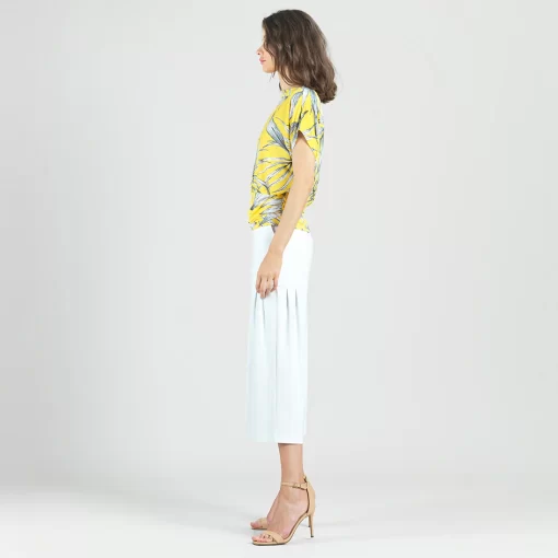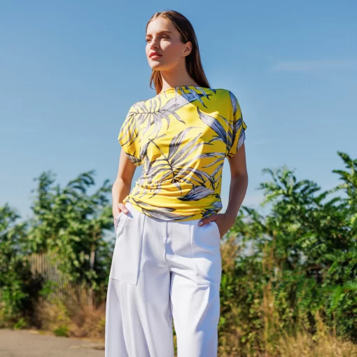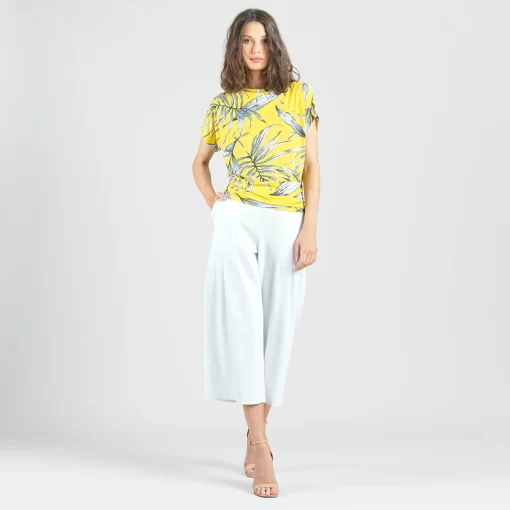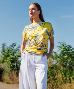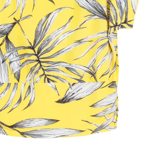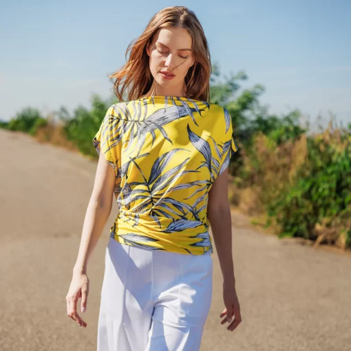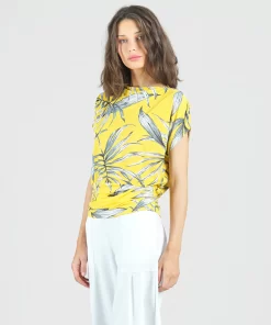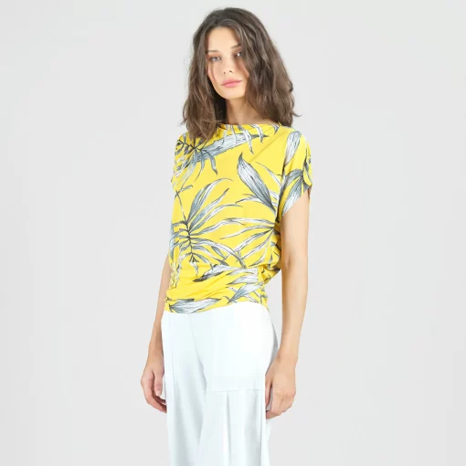 Shine bright as you bask in our Sunlit Palm Side Ruched Boat Neck Top! Featuring a boat neckline, short dolman sleeves, and a waist-hugging side ruched hemline, that displays an elegant blouson silhouette. A timeless print displaying a traditional damask pattern of symmetric medallions reimagined in soft watercolor shades of pale coral-orange, tomato red, and white that blend to create an artistic gradient. ♥ Each piece is a unique, one-of-a-kind print and print placement will vary.Carefree Travel Fabric – Soft Silky Knit Our signature poly blend fibers offer luxurious softness with lightweight, wrinkle-free comfort. This easy-care fabric is quick drying and cooler than linen or cotton, making it perfect for on-the-go wear.Side Ruched Hemline Wrinkle Free Travel Friendly Ultra Lightweight Soft Knit Fabric Breathable Jersey-Like Feel