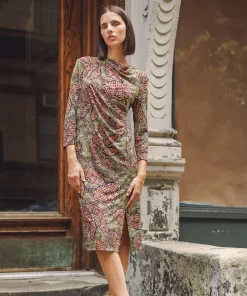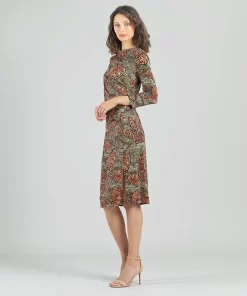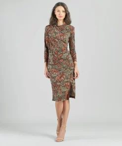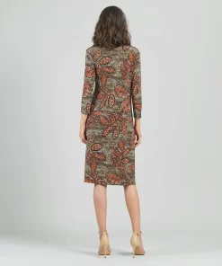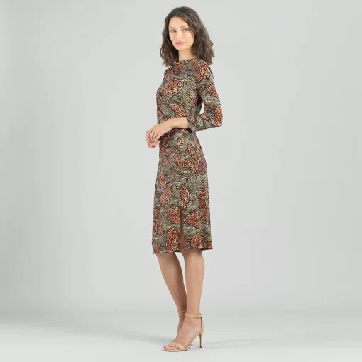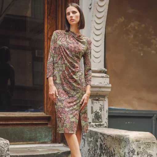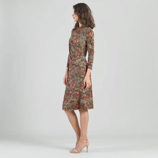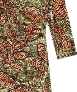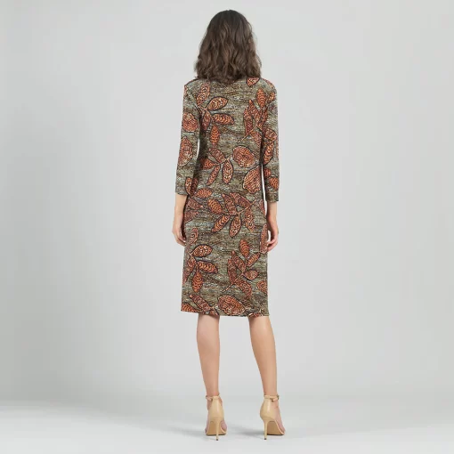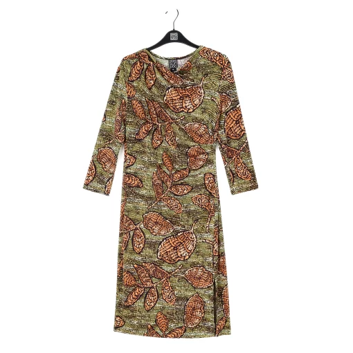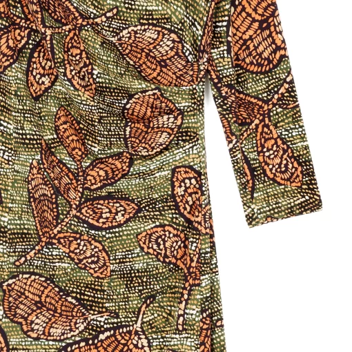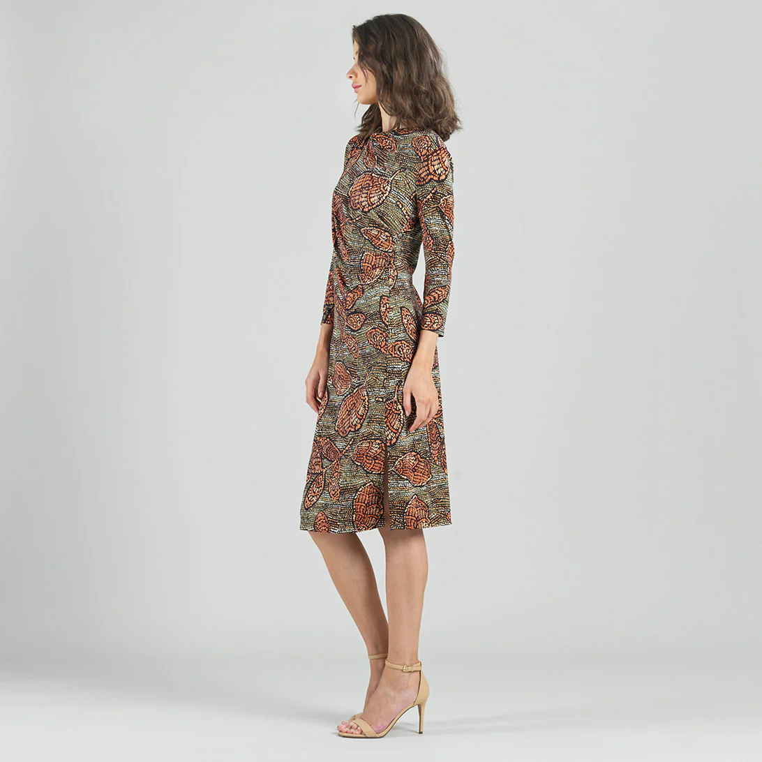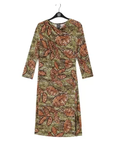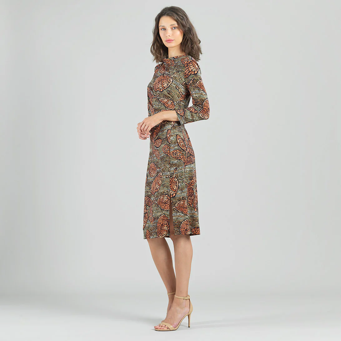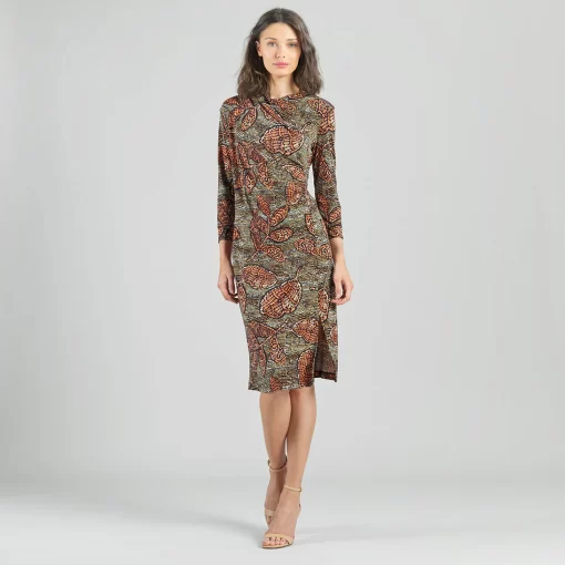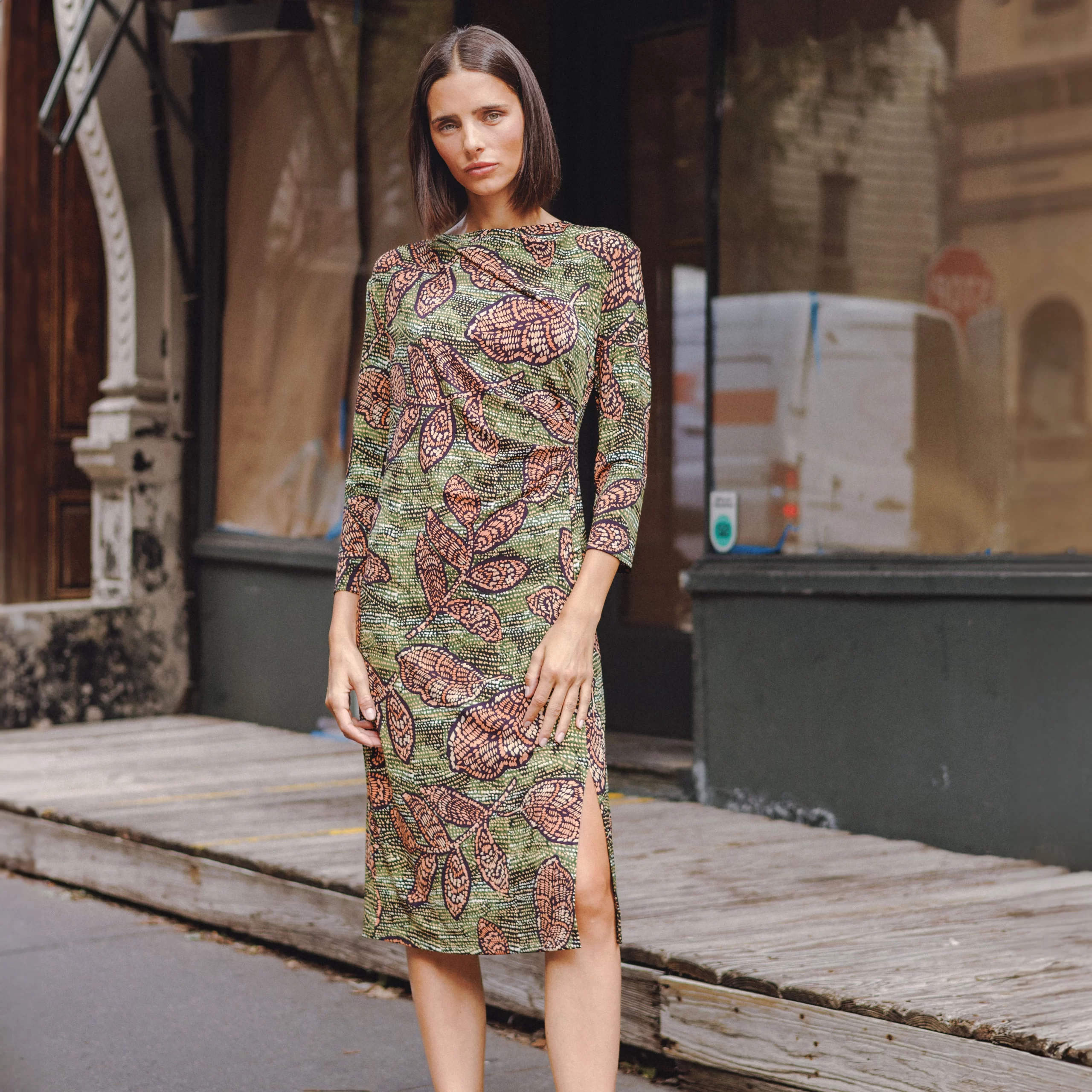 Get ready to ‘foliage’ in love with our Mosaic Leaves Side Slit 3/4 Sleeve Midi Dress! This stunning dress features a high draped neckline, 3/4 sleeves, a ruched side bodice that creates a flattering draped silhouette, and a 10″ left side slit with a midi hemline. A beautiful mosaic of Autumn leaves that display rich, earth-tone shades of terracotta, fern green, black, and subtle hints of white, inspired by nature’s artistry. ♥ Each piece is a unique, one-of-a-kind print and print placement will vary. Carefree Travel Fabric – Soft Silky Knit Our signature poly blend fibers offer luxurious softness with lightweight, wrinkle-free comfort. This easy-care fabric is quick drying and cooler than linen or cotton, making it perfect for on-the-go wear.10″ Left Side Slit Wrinkle Free Travel Friendly Ultra Lightweight Soft Knit Fabric Breathable Jersey-Like Feel