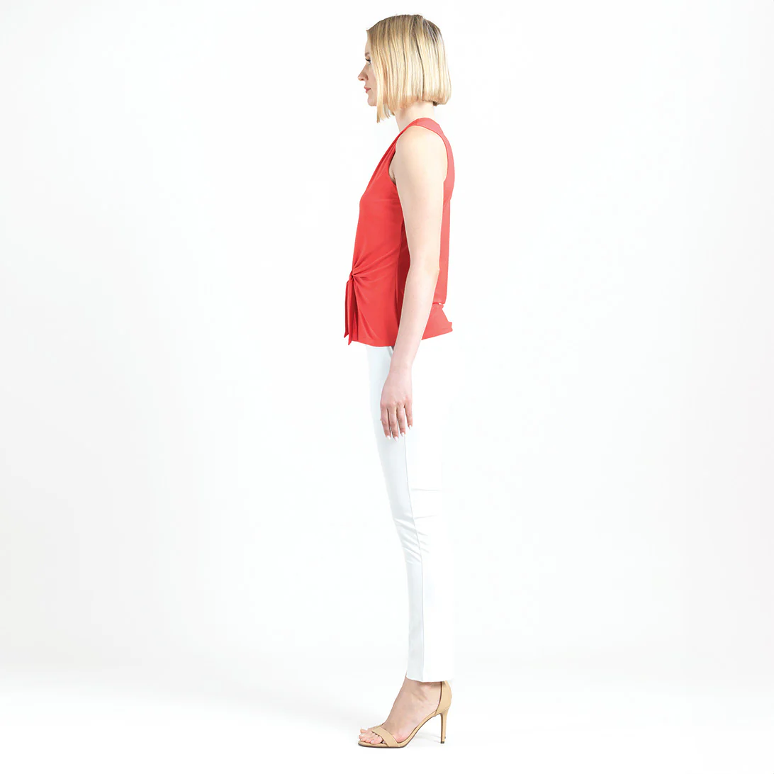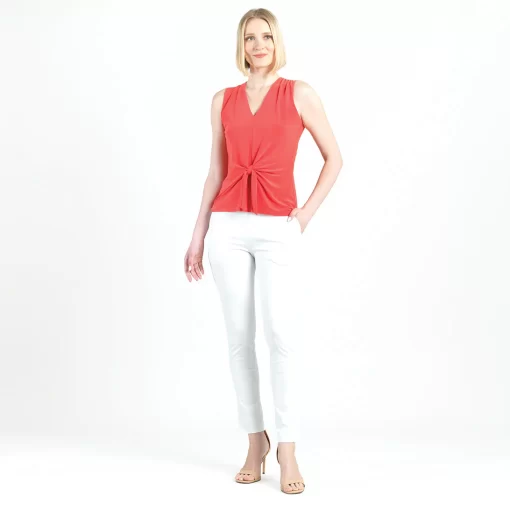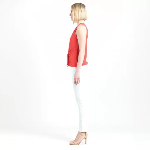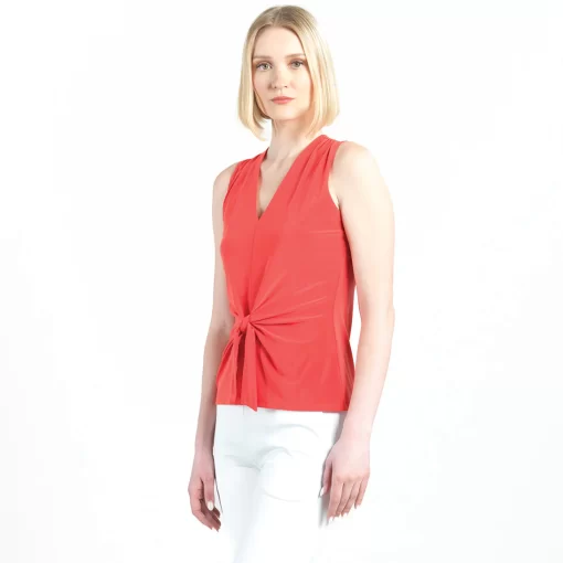 Our Sleeveless V-Neck Center Front Tie Top combines minimalist fashion with a modern twist! This flattering sleeveless top features a classic v-neckline, pleated shoulder seam, a vertical neck-to-hem center seam, and a front-center waist tie that creates a beautiful draped effect that accentuates your natural figure. Our Coral shade is a warm color with vibrant, tomato-red undertones. Carefree Travel Fabric – Soft Silky Knit Our signature poly blend fibers offer luxurious softness with lightweight, wrinkle-free comfort. This easy-care fabric is quick drying and cooler than linen or cotton, making it perfect for on-the-go wear.Wrinkle Free Travel Friendly Ultra Lightweight Soft Knit Fabric Breathable Jersey-Like Feel