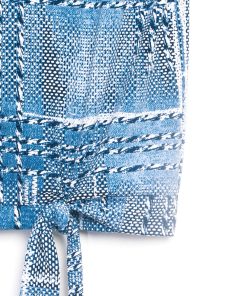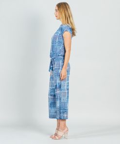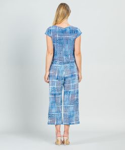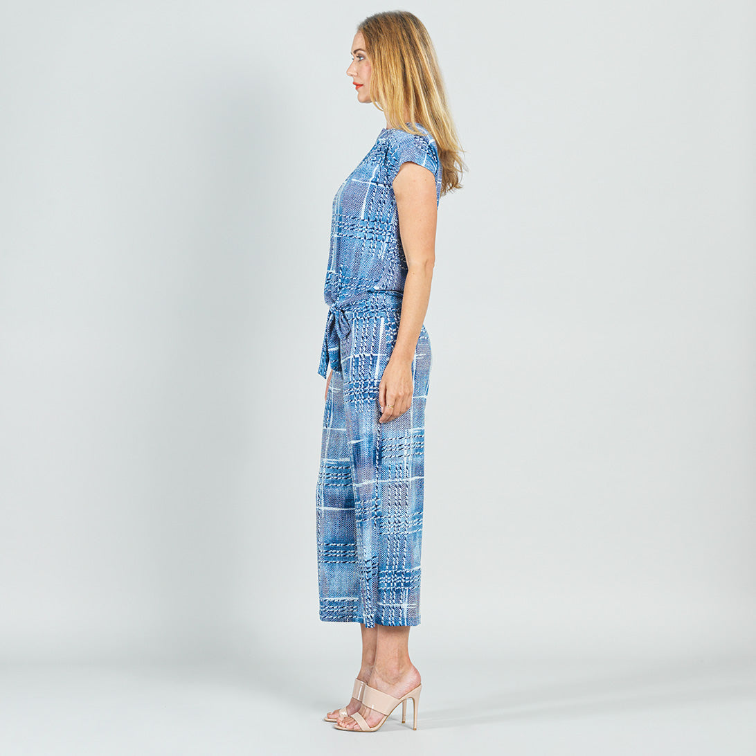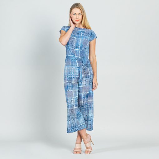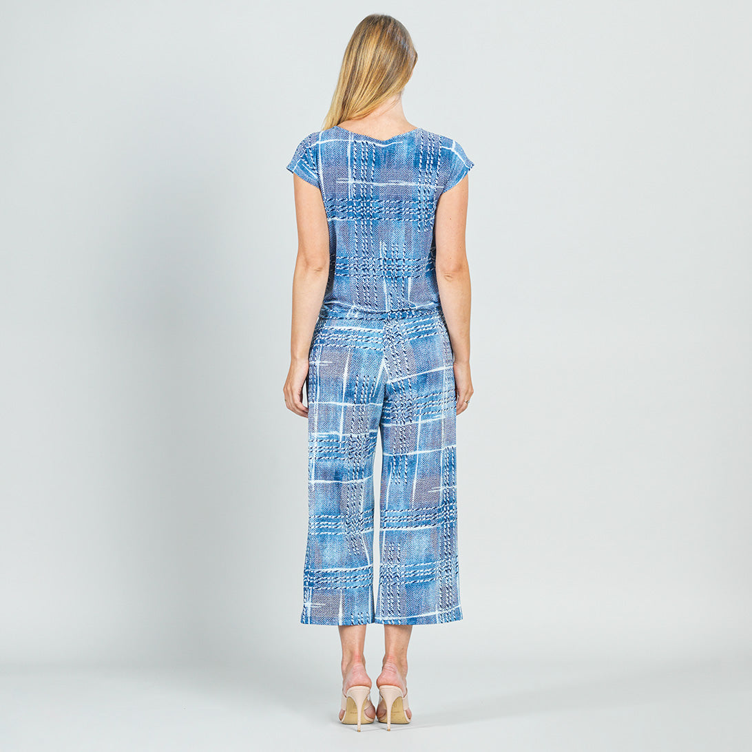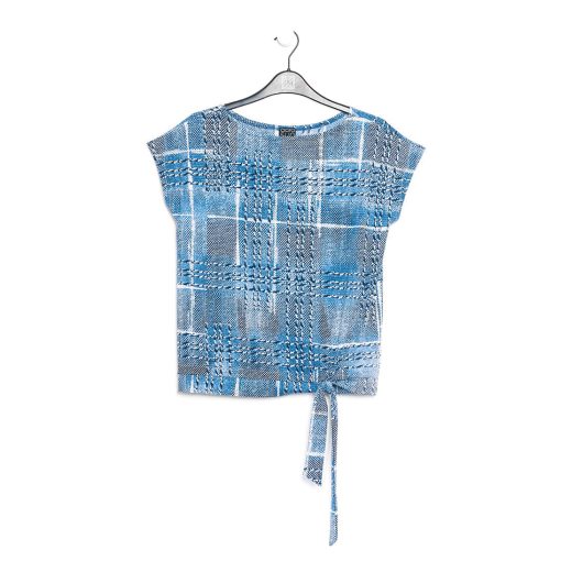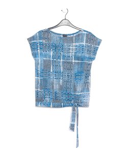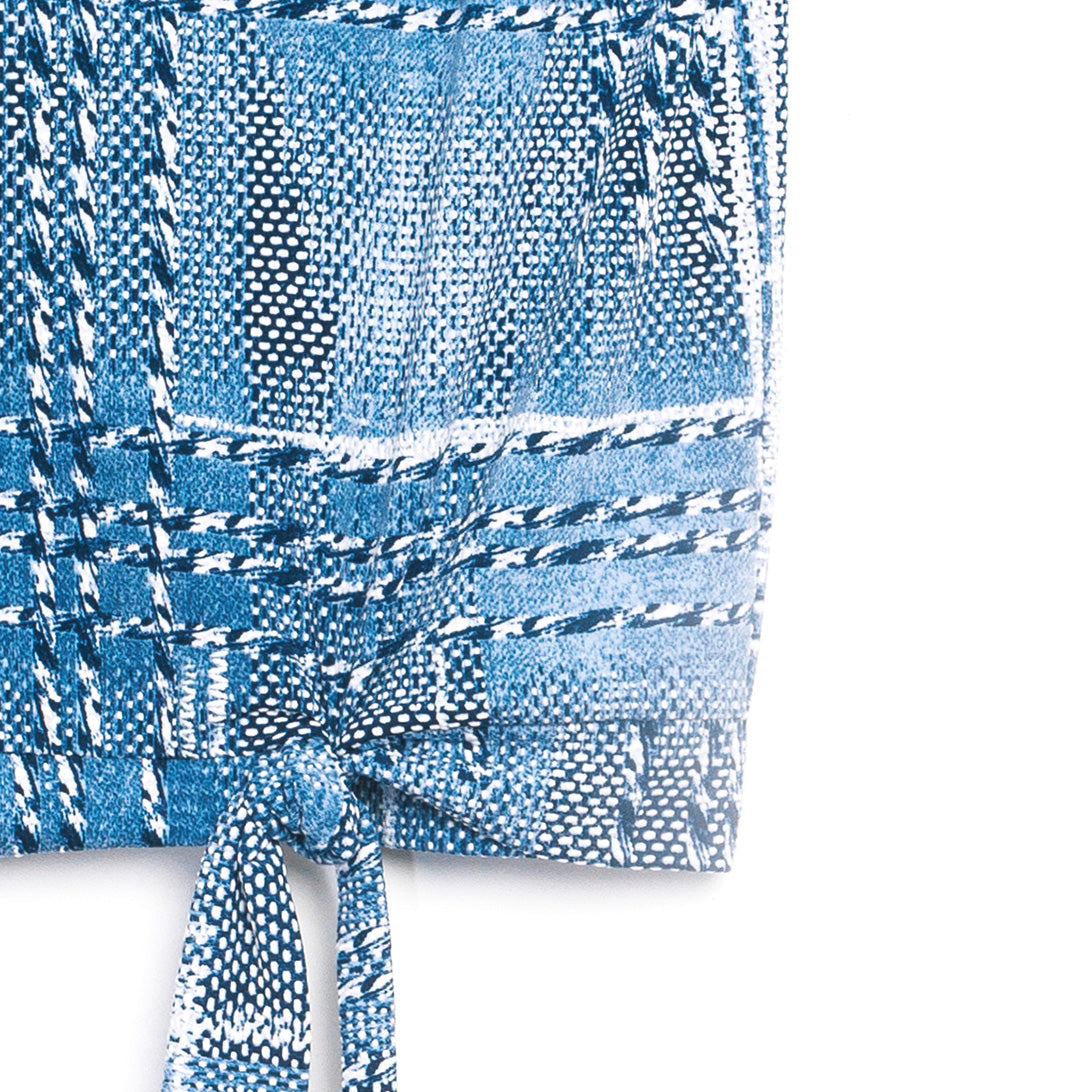 Our Denim Plaid Textured Cap Sleeve Tie Hem Top! This style features a boat neckline, cap sleeves, a boxy silhouette, and a straight-seamed hemline with tie detail. Shades of navy, true blue, and white, compose a large-scale, plaid pattern of crisscrossed lines in various widths, with subtle hints of white threading which create a 3D-like texture. ♥ Each piece is a unique, one-of-a-kind print and print placement will vary.Carefree Travel Fabric – Soft Silky Knit with Embossed Texture Our signature poly blend fibers feature an embossed texture print. It’s breathable, quick-drying, and wrinkle-free – making it ideal for travel. Cooler than linen or cotton and easy to care for, it provides an unbeatable combination of style and comfort. Wrinkle Free Travel FriendlyBreathable Jersey-Like FeelEmbossed Threading Detail