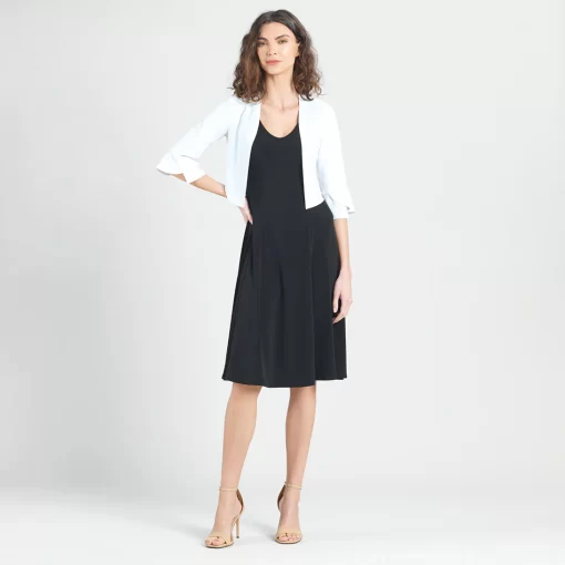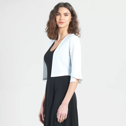 Our Tulip Cuff Shrug is the perfect piece to layer all of your favorite Clara Sunwoo tanks! Featuring an open front, no closure with vented elbow-length tulip cuffed sleeves, and a cropped hem silhouette! Carefree Travel Fabric – Soft Silky Knit Our signature poly blend fibers offer luxurious softness with lightweight, wrinkle-free comfort. This easy-care fabric is quick drying and cooler than linen or cotton, making it perfect for on-the-go wear. Wrinkle Free Travel Friendly Ultra Lightweight Soft Knit Fabric Breathable Jersey Like Feel